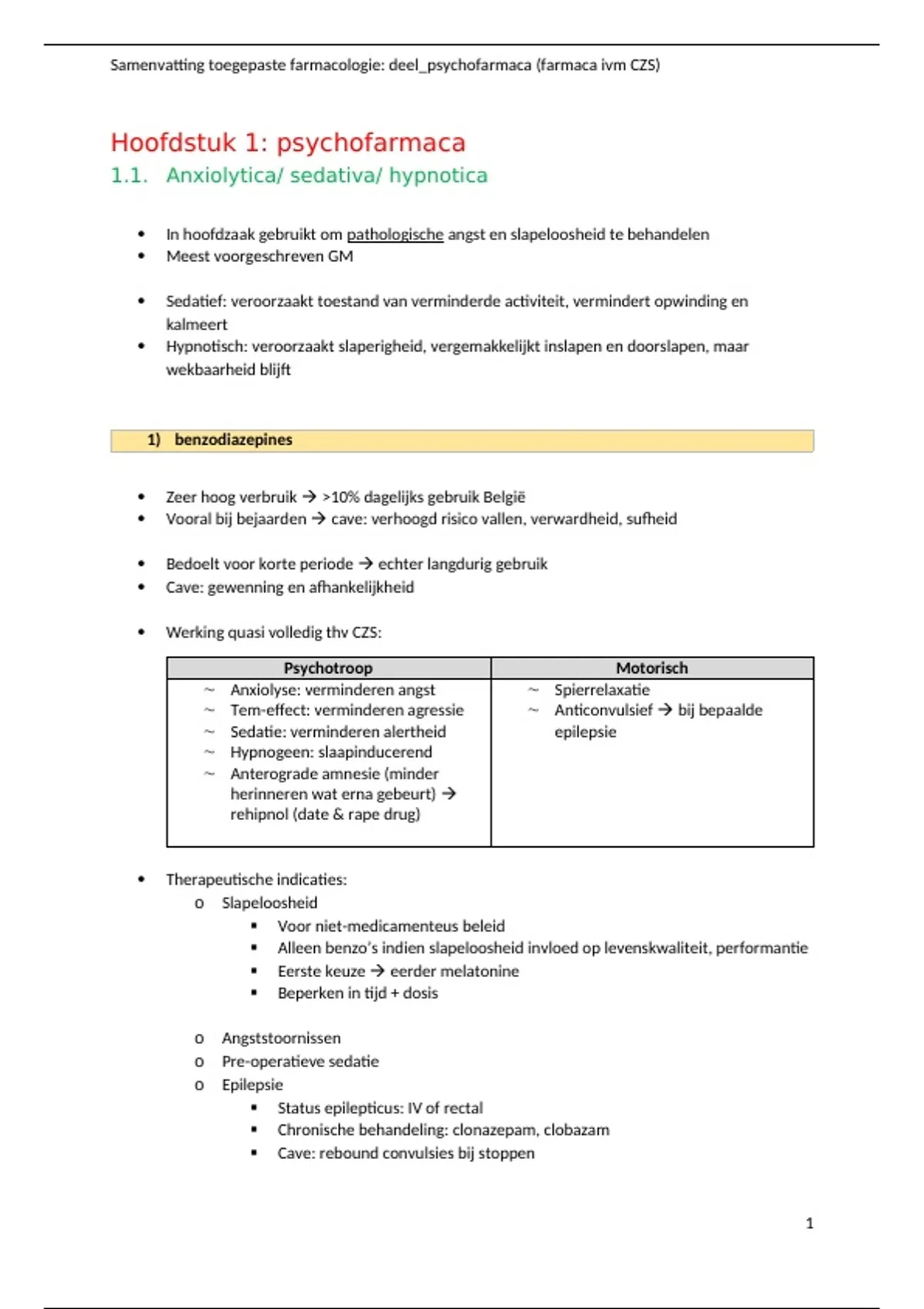 Samenvatting toegepaste farmacologie: deel_psychofarmaca (farmaca ivm CZS)