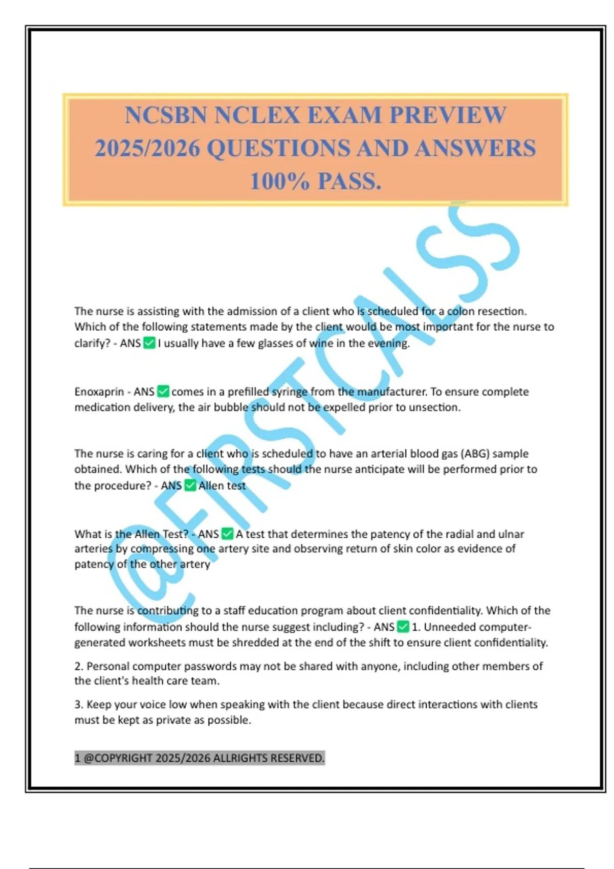 NCSBN NCLEX EXAM PREVIEW 2025/2026 QUESTIONS AND ANSWERS 100% PASS.