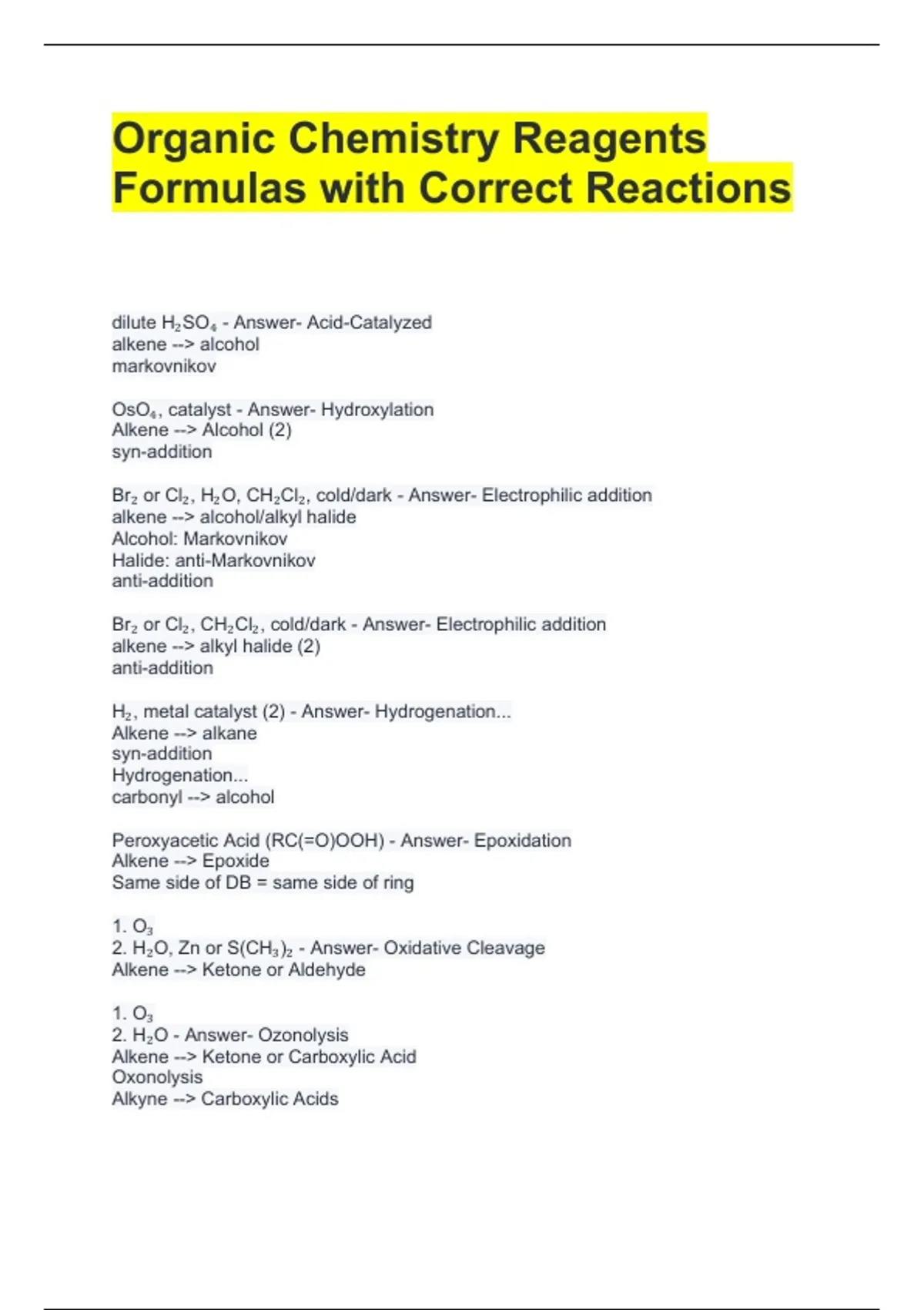 Organic Chemistry Reagents Formulas with Correct Reactions