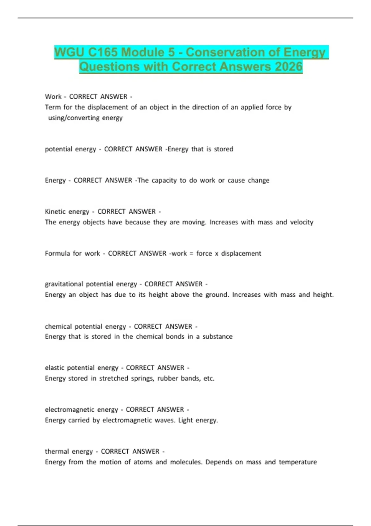 WGU C165 Module 5 - Conservation of Energy Questions with Correct Answers 2026