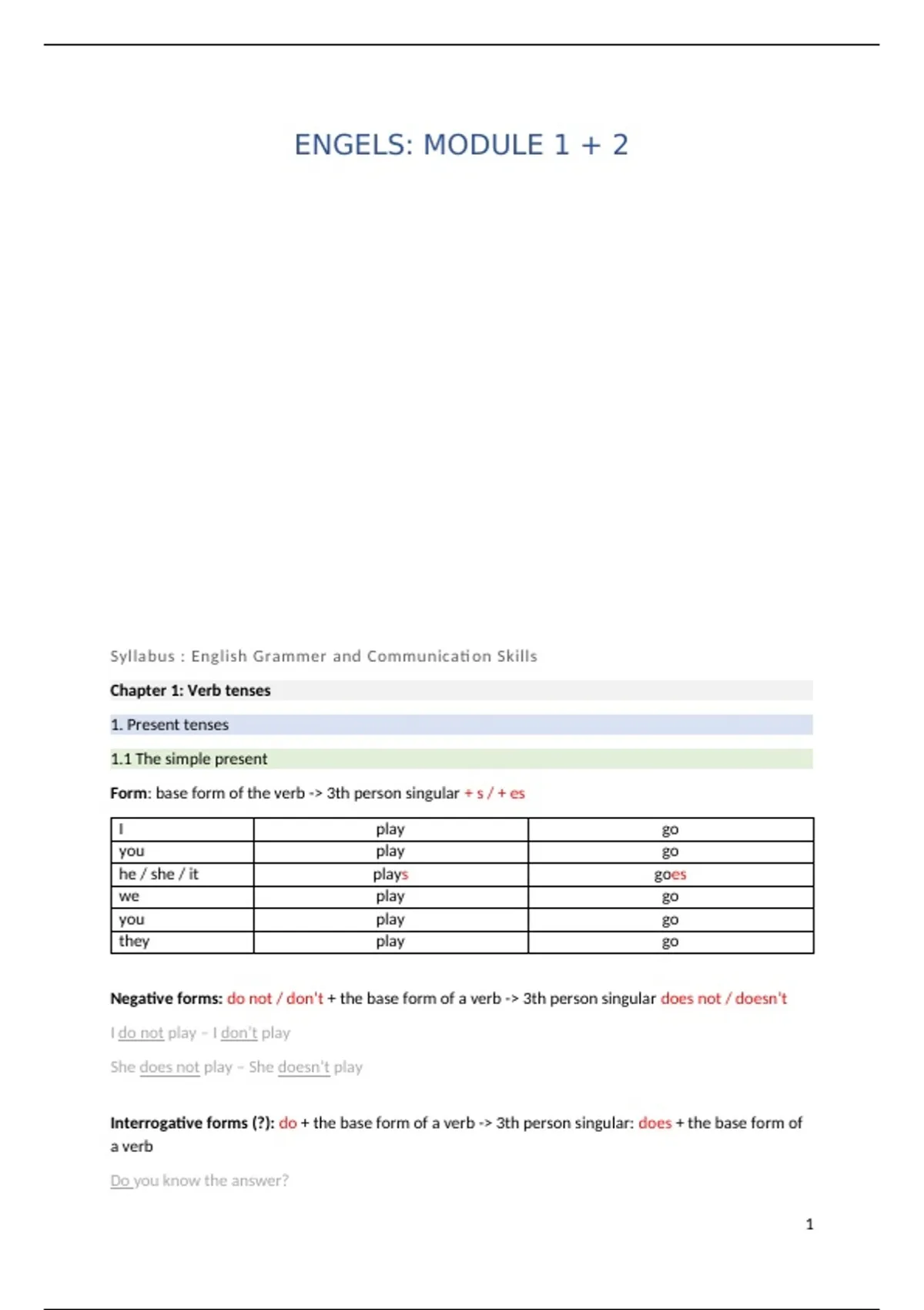 Een uitgebreide samenvatting van Engels module 1 en 2. Deze samenvatting bevat zowel theorie als woordenschat. Schooljaar