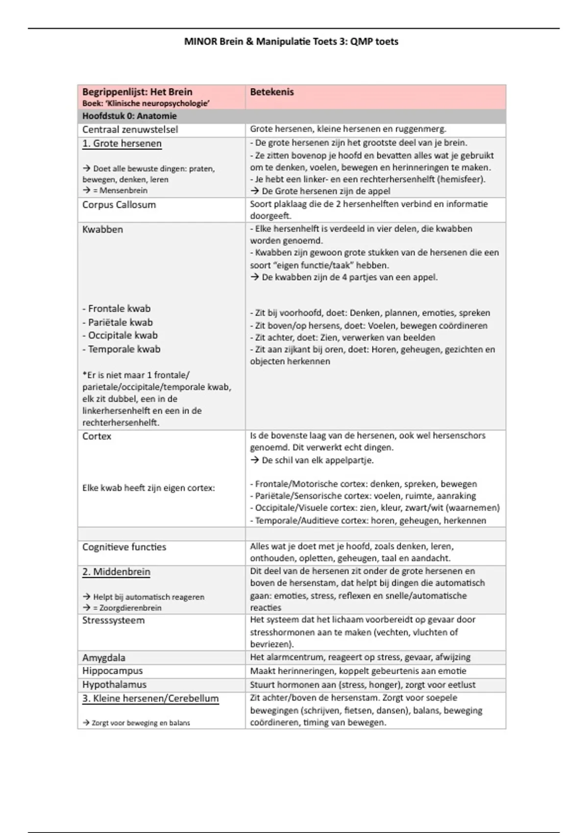 De samenvatting over de QMP toets van de minor Brein&Manipulatie op de CHE. Hierin staan alle begrippen die je moet weten voor de toets, afkomstig uit colleges, begrippenlijsten, toetsmatrijs, het boek klinische neuropsychologie en het boek overreden en verleiden. Zo leer jij precies wat nodig is!