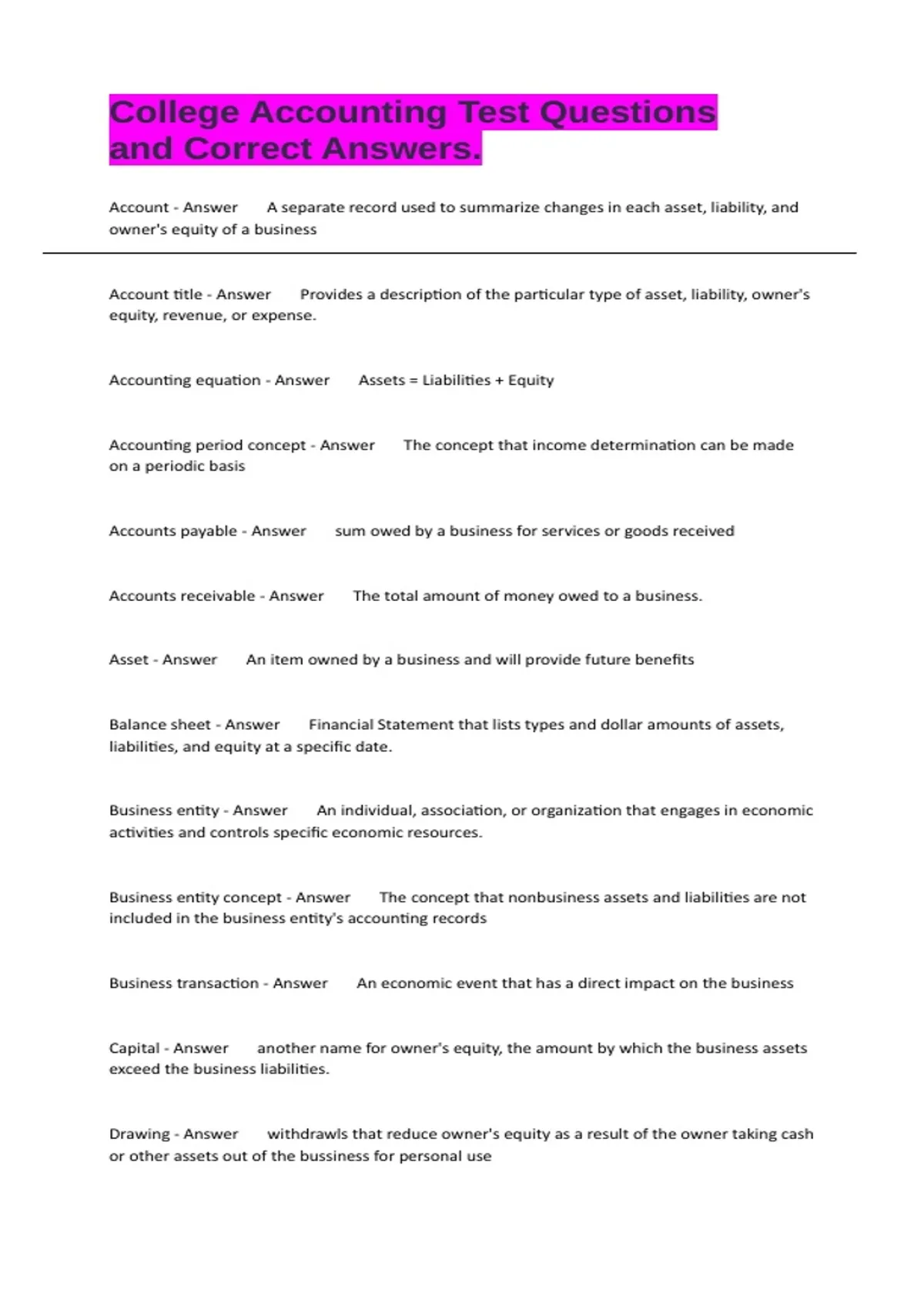 Accounting equation - Answer Assets = Liabilities + Equity