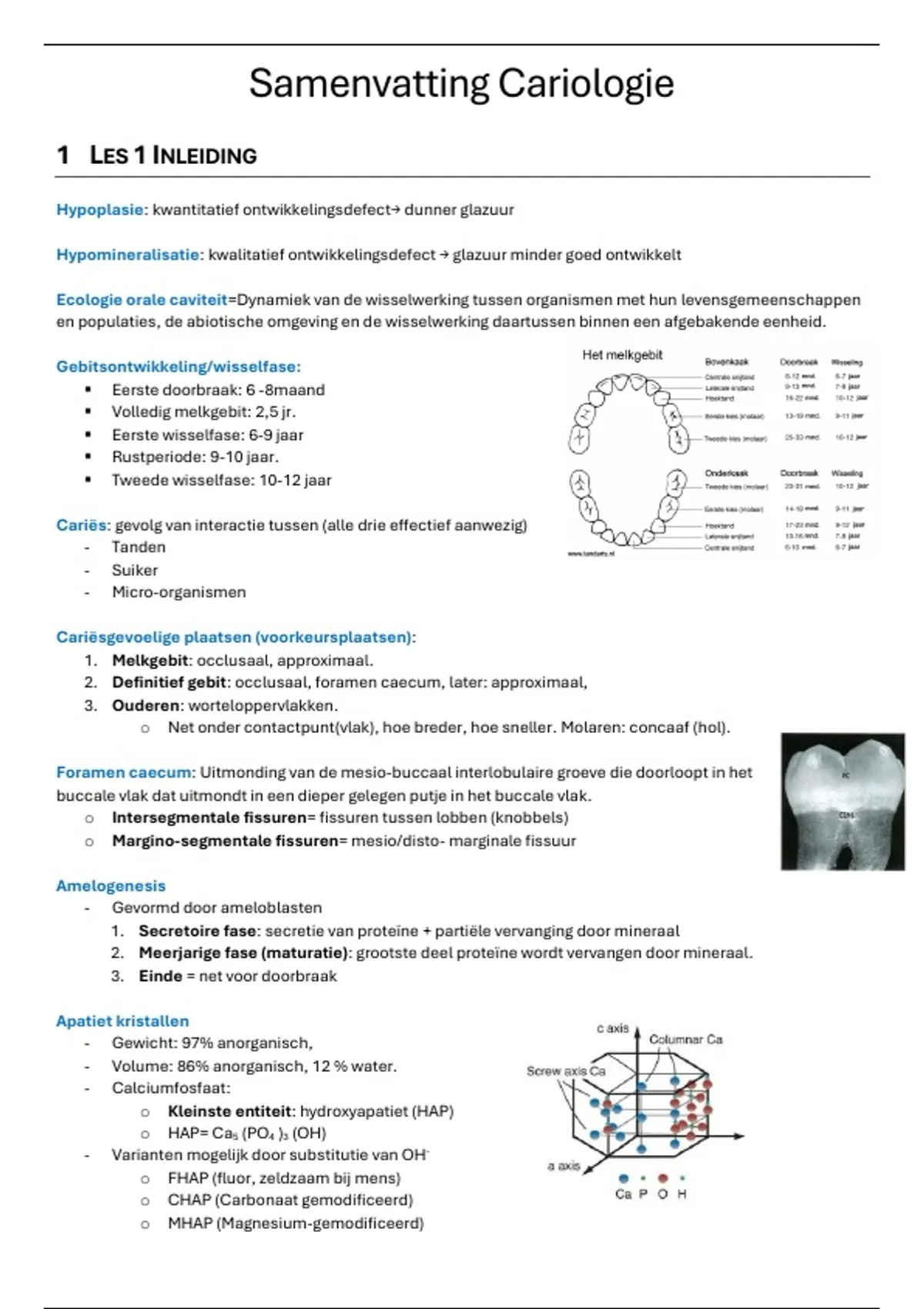 Uitgebreide notities van alle lessen cariologie. ecologie orale caviteit, gebitsontwikkeling, pellicle, tandplaque, etiologie/pathogenese, histologie, diagnose (ICDAS, RX), risicobepaling (CAMBRA, Cariogram), erosie, bruxisme en abfractie. Met schema's zoals Stephans curve, Keyes Venn-diagram, BEWE-score en fluoride-effecten. ​ Ideaal voor examens, praktische toepassingen en cariësdiagnostiek – spaar tijd en haal topprestaties! (gestructureerd & compleet).