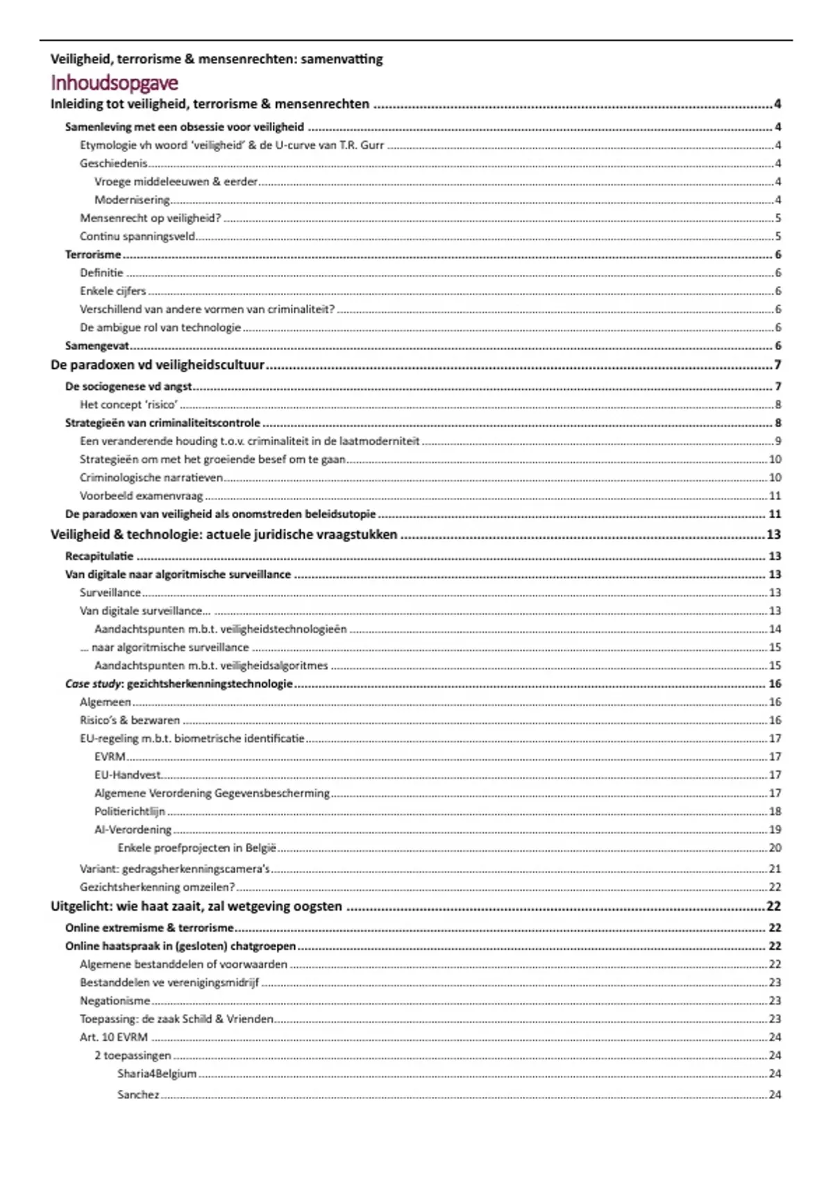 Een volledige samenvatting van het vak 'Veiligheid, terrorisme en mensenrechten', dat in de master als keuzevak door prof. S. J. Royer wordt gegeven. Het bevat de PowerPoint-slides en mijn lesnotities bij alle hoofdstukken (inclusief de te kennen gastcolleges).