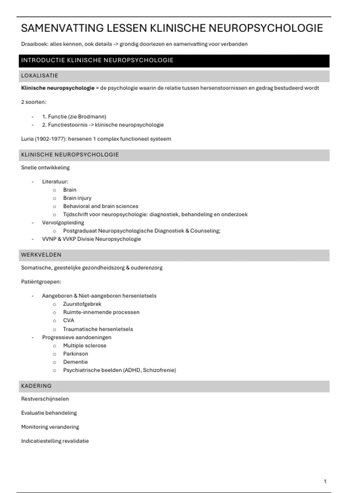SAMENVATTING LESSEN KLINISCHE NEUROPSYCHOLOGIE