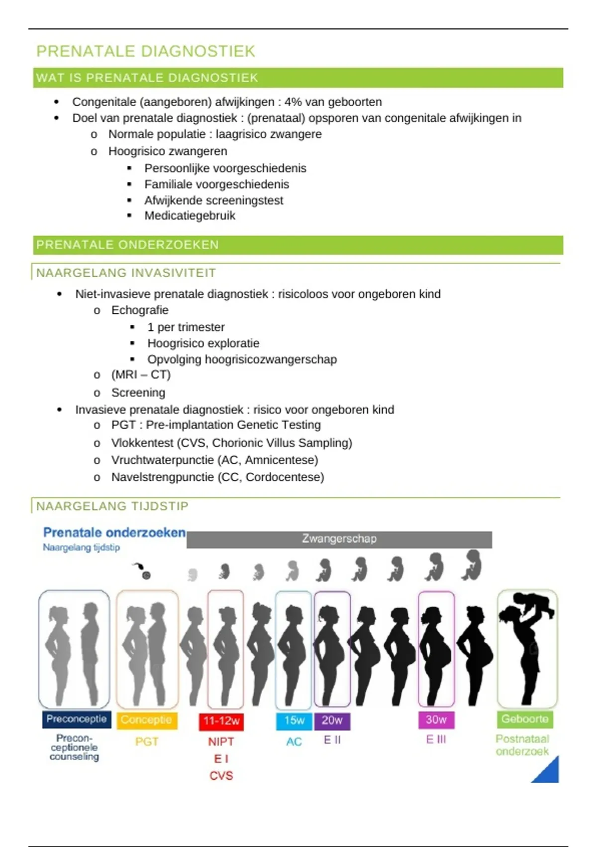 Dit is een samenvatting van de les over prenatale diagnostiek (2VRK16). De samenvatting bevat zowel de cursus, als lesnotities en powerpoint.
