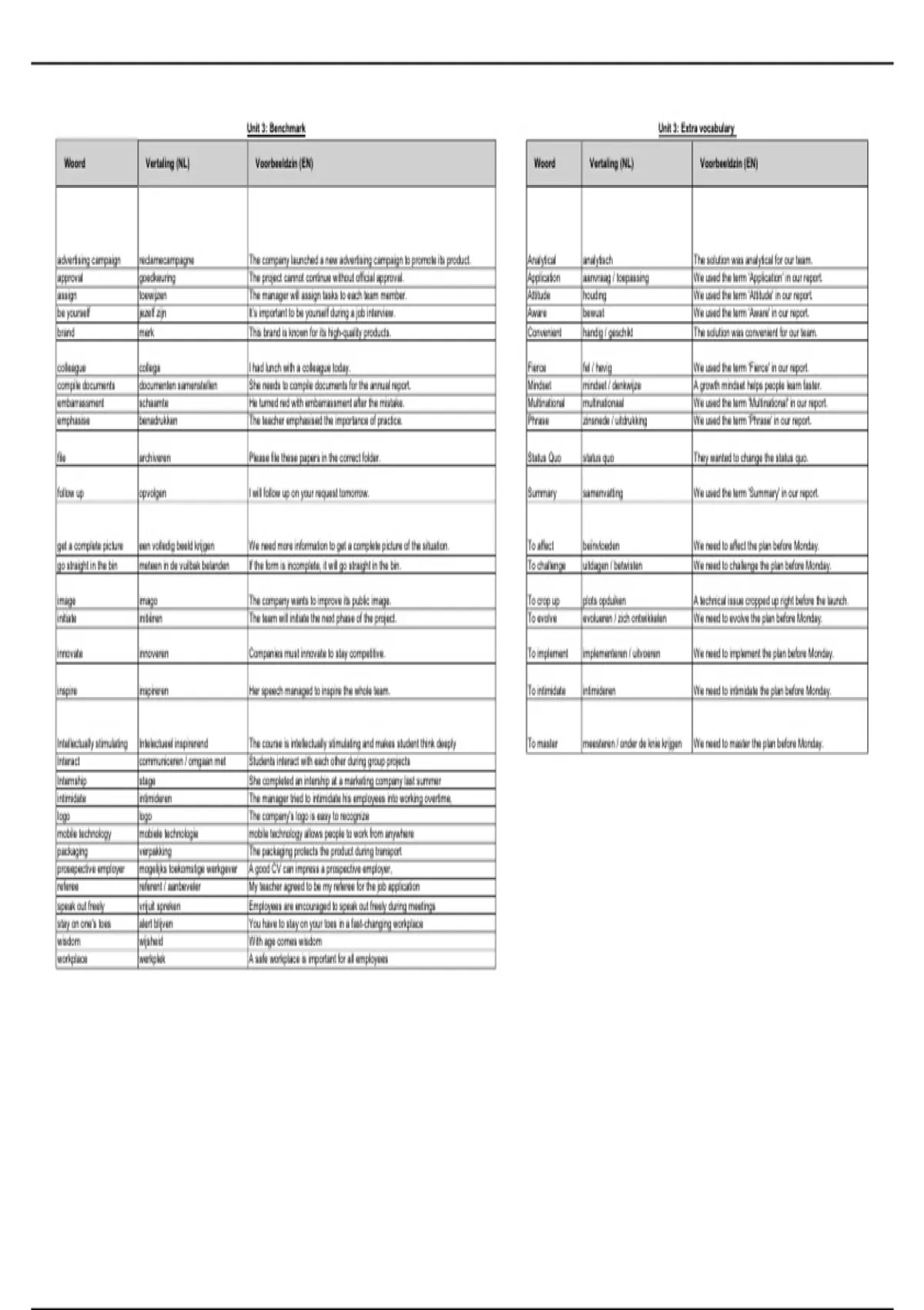 Woord Vertaling (NL) Voorbeeldzin (EN) Woord Vertaling (NL) Voorbeeldzin (EN)