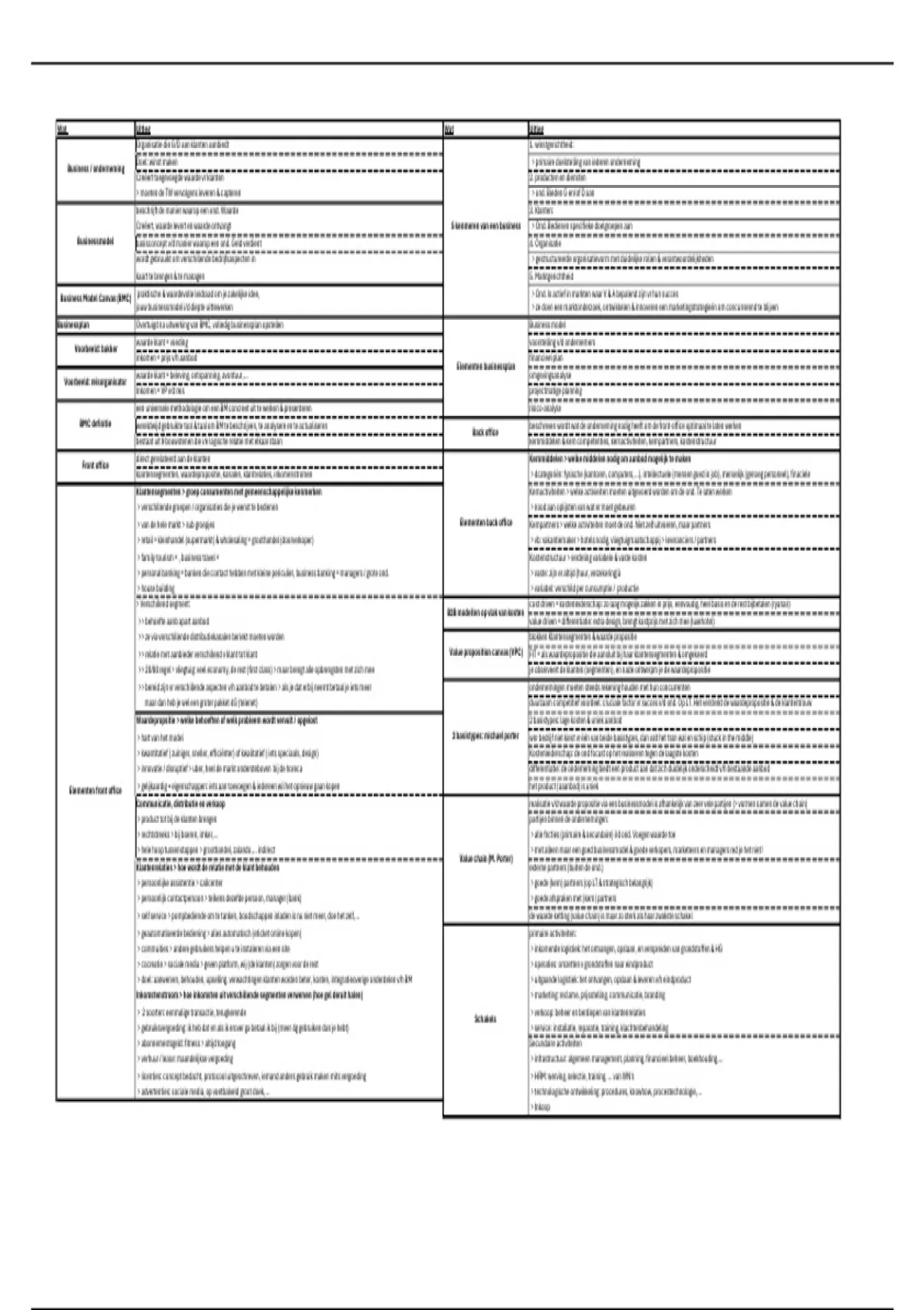 klantensegmenten, waardepropositie, kanalen, klantrelaties, inkomenstromen > 4categoriën: fysische (kantoren, computers,…), intellectuele (mensen goed in job), menselijk (genoeg personeel), finaciele