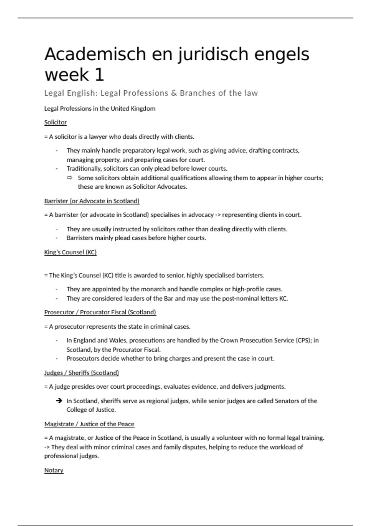 Dit is een samenvatting van het vak Academisch en Juridisch Engels, eerste bachelor rechten aan de UA. In deze samenvatting worden de volledige week 1 tot en met week 4 behandelt, inclusief de teksten met hun Nederlandse vertaling