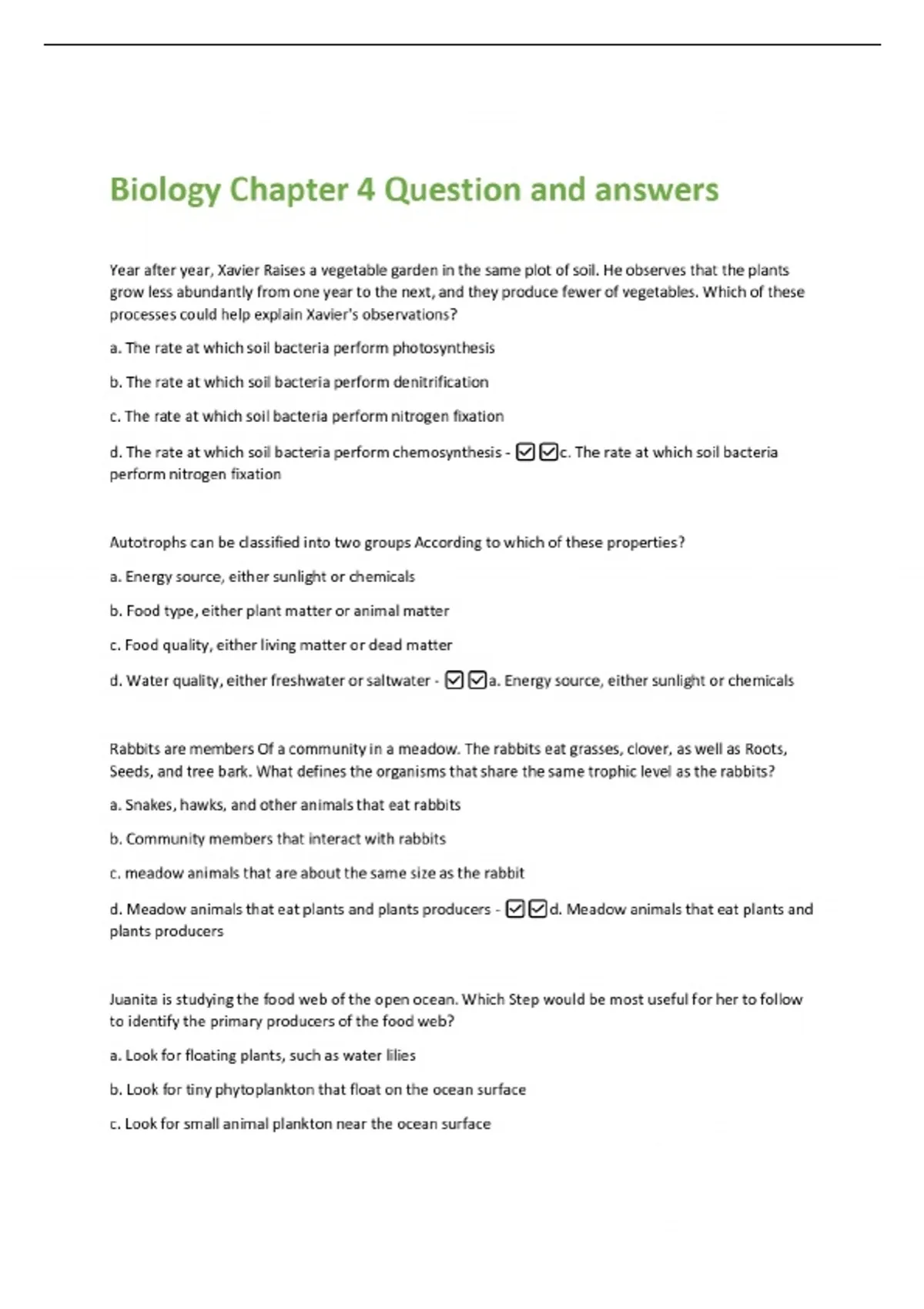 Biology Chapter 4 Question and answers Year after year, Xavier Raises a vegetable garden in the same plot of soil. He observes that the plants grow less abundantly from one year to the next, and they produce fewer of vegetables. Which of these processes could help explain Xavier's observations? a. The rate at which soil bacteria perform photosynthesis b. The rate at which soil bacteria perform denitrification c. The rate at which soil bacteria perform nitrogen fixation d. The rate at which soil bacteria perform chemosynthesis - c. The rate at which soil bacteria perform nitrogen fixation Autotrophs can be classified into two groups According to which of these properties? a. Energy source, either sunlight or chemicals b. Food type, either plant matter or animal matter c. Food quality, either living matter or dead matter d. Water quality, either freshwater or saltwater - a. Energy source, either sunlight or chemicals