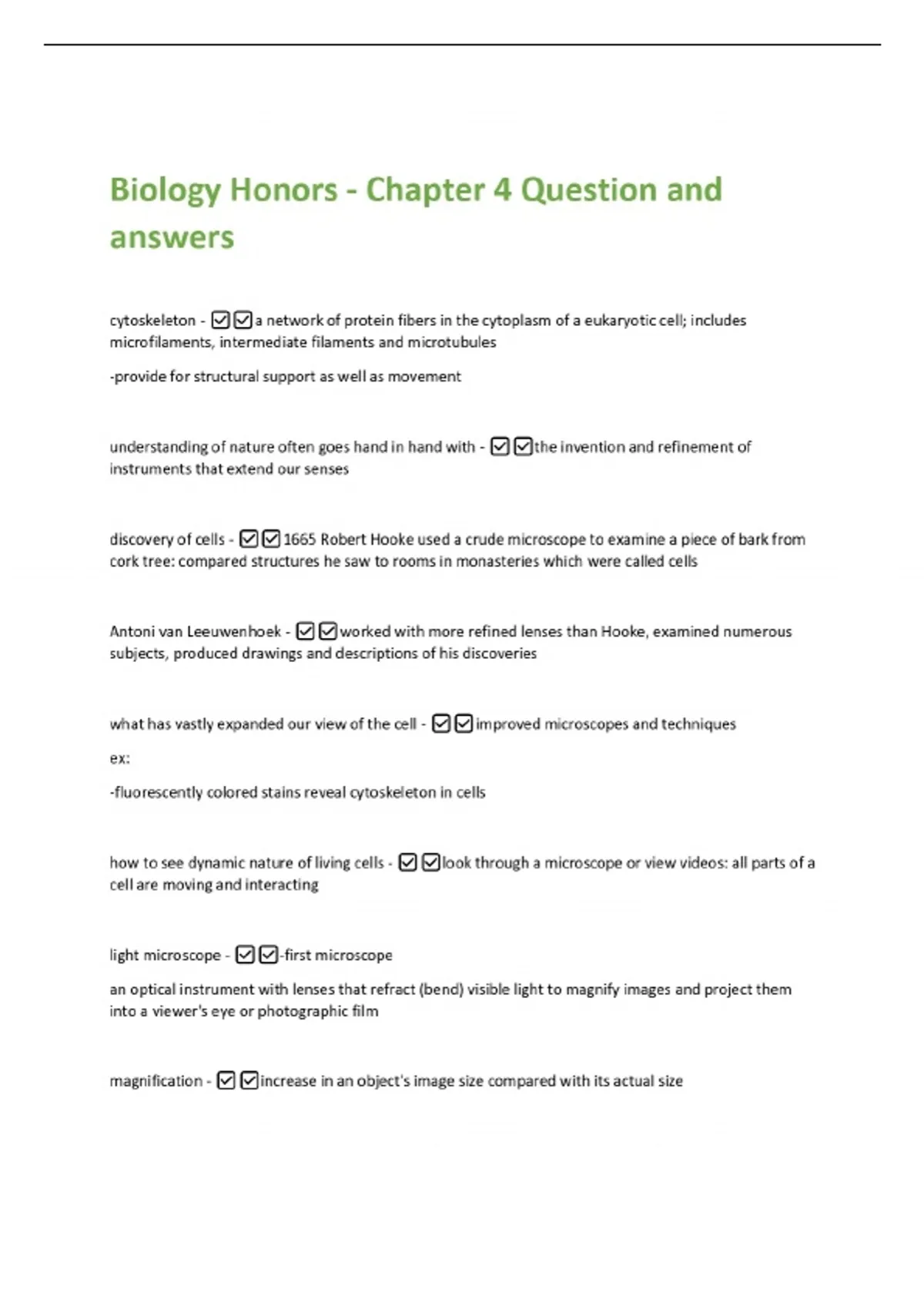 Biology Honors - Chapter 4 Question and answers cytoskeleton - a network of protein fibers in the cytoplasm of a eukaryotic cell; includes microfilaments, intermediate filaments and microtubules -provide for structural support as well as movement understanding of nature often goes hand in hand with - the invention and refinement of instruments that extend our senses discovery of cells - 1665 Robert Hooke used a crude microscope to examine a piece of bark from cork tree: compared structures he saw to rooms in monasteries which were called cells Antoni van Leeuwenhoek - worked with more refined lenses than Hooke, examined numerous subjects, produced drawings and descriptions of his discoveries