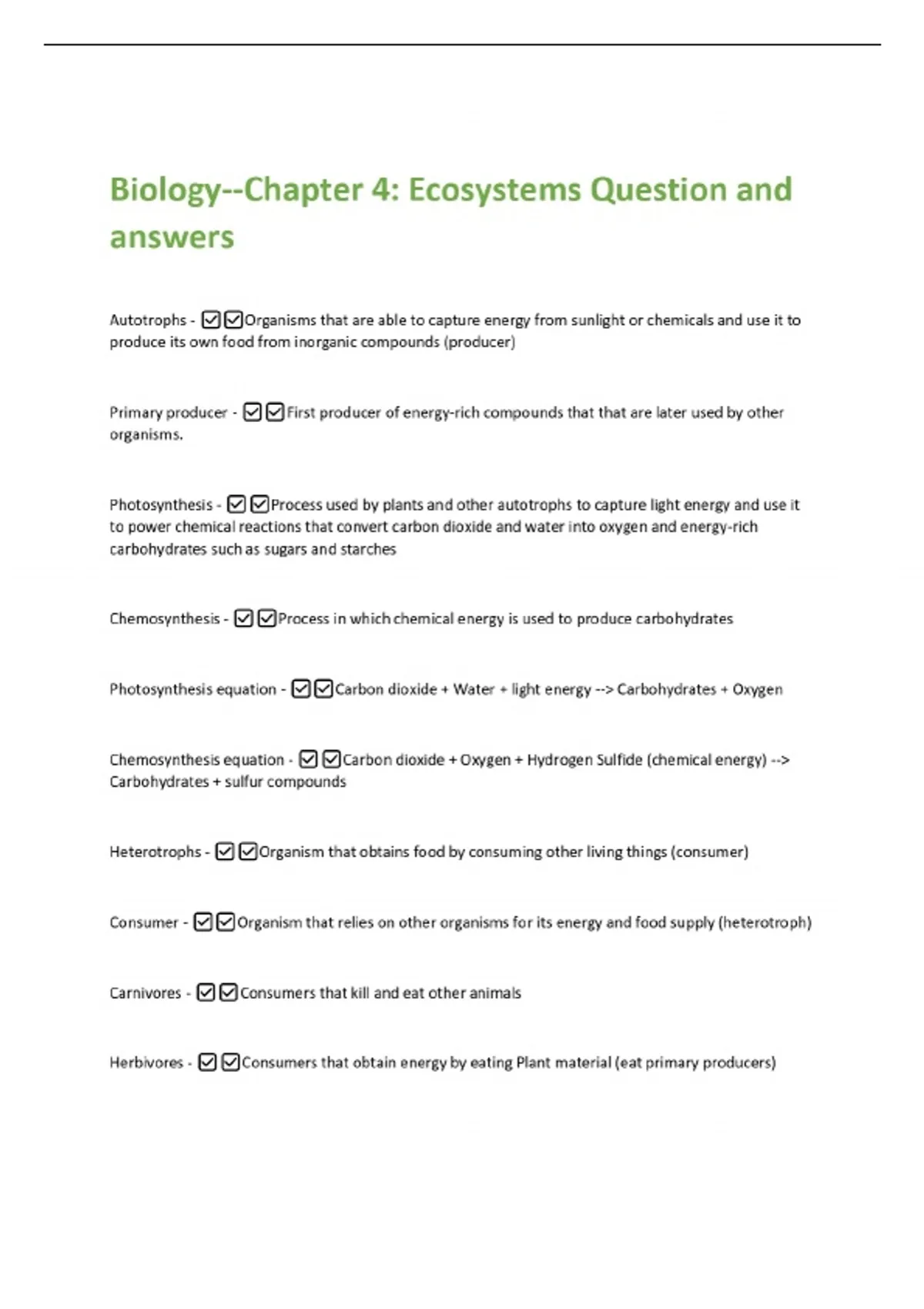 Biology--Chapter 4: Ecosystems Question and answers Autotrophs - Organisms that are able to capture energy from sunlight or chemicals and use it to produce its own food from inorganic compounds (producer) Primary producer - First producer of energy-rich compounds that that are later used by other organisms. Photosynthesis - Process used by plants and other autotrophs to capture light energy and use it to power chemical reactions that convert carbon dioxide and water into oxygen and energy-rich carbohydrates such as sugars and starches