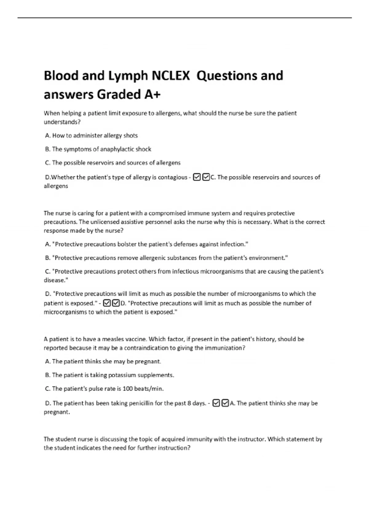 Blood and Lymph NCLEX Questions and answers Graded A+