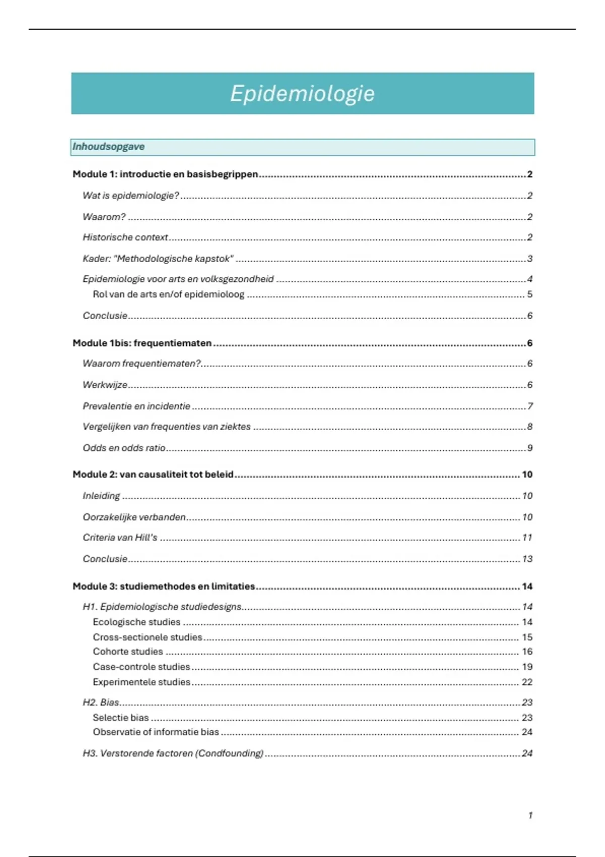 Samenvatting van epidemiologie. Deze samenvatting bevat alle leerstof van Soubry uit de theoretische clips met aanvullingen van de les. Module 4 (workshop) en 5 (prof. Vermeersch) zijn hier niet aanwezig.