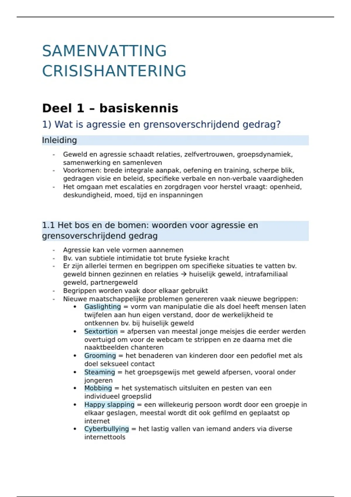Samenvatting van het vak crisishantering. Wordt gegeven in de richting orthopedagogie, KDG in het tweede jaar. Samenvatting van het boek: 'Antwoorden op agressie en grensoverschrijdend gedrag'. Deel 1 en deel 2 zijn samengevat. Deel 3 zijn oefeningen. Ook notities uit de les.