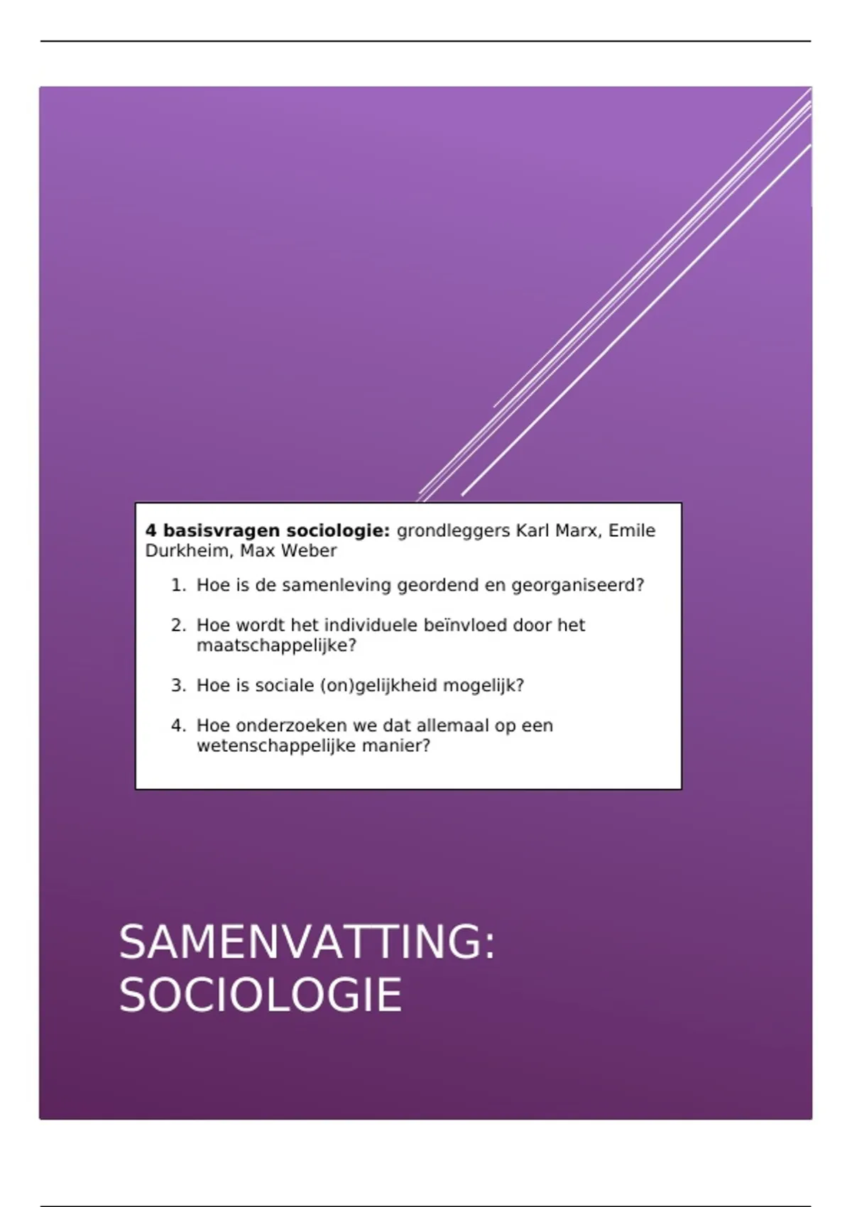 Samenvatting Sociologie van Luuc Brans aan KUL. Dit is uitgebreid wat er allemaal in de lessen verteld werd. Dus alles wat je moet kennen voor het examen. Wel wil ik nog vermelden dat H9 bij ons zelfstudie was met het boek en deze dus wel nog zelf moet samenvatten om compleet te zijn. Deze prof vindt lessen het allerbelangrijkste, verlies geen tijd met heel het boek (MPL) samen te vatten, want hij vroeg hier niks van op het examen. Heel veel vrienden gebruikten mijn samenvatting en examen ging zeer vlot! Succes!