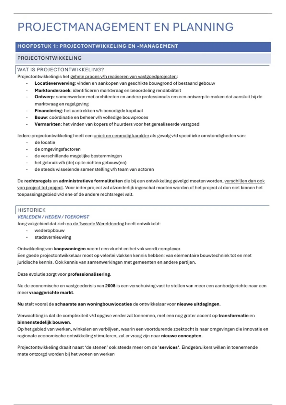 Dit is een samenvatting van het deel projectmanagement en planning van het vak projectontwikkeling tweede jaar vastgoed