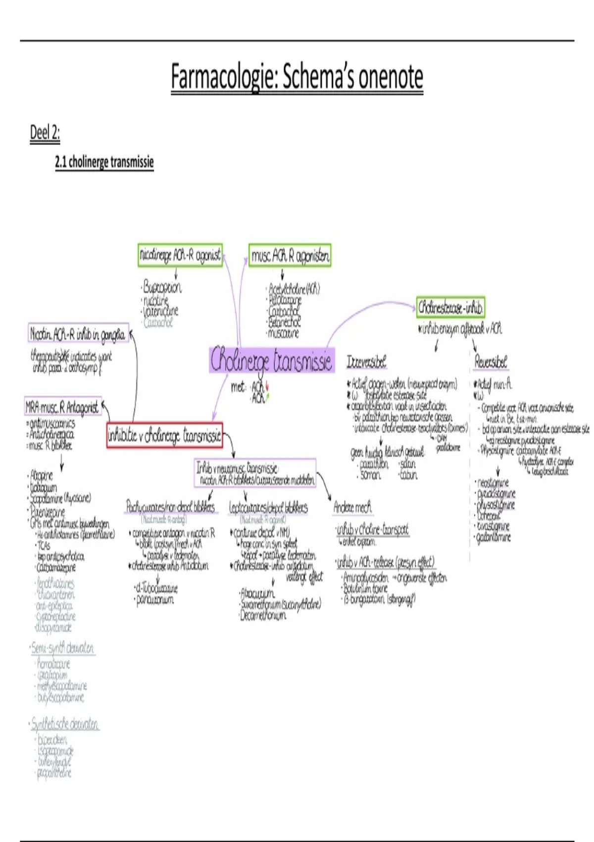 Digitaal handgeschreven schema's van alle geneesmiddelen die aan bod kwamen tijdens cursussen deel 2,3,4,5. Zeer handig voor de grote bespreekvraag op het mondelinge examen of voor het grote overzicht nog te kunnen behouden door alle geneesmiddelen.