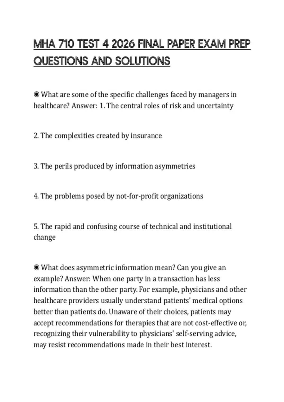 MHA 710 TEST 4 2026 FINAL PAPER EXAM PREP QUESTIONS AND SOLUTIONS