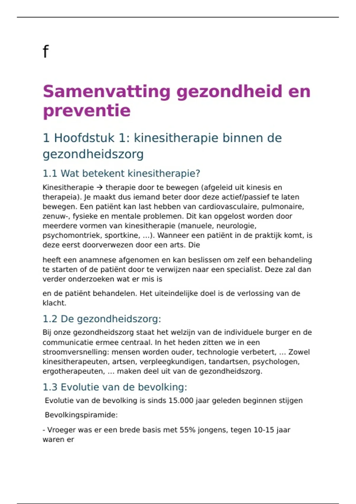 Deze samenvatting behandelt kinesitherapie binnen de gezondheidszorg, de rol van kinesitherapeuten, en de evolutie van de bevolking. Het bespreekt ook de preventieve en curatieve aspecten van kinesitherapie, evenals de medische terminologie en epidemiologie van ziekten.