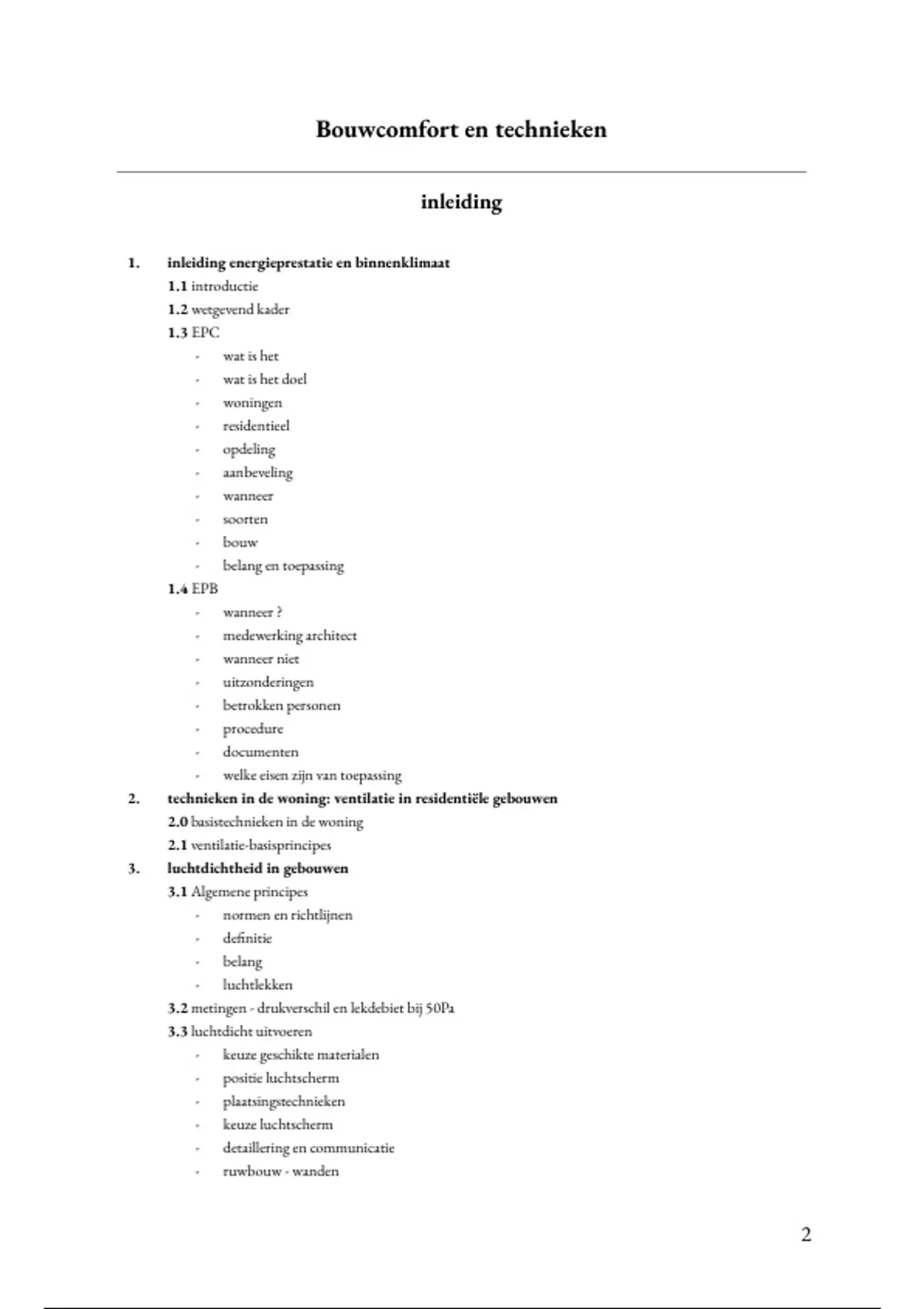 Dit is een zeer overzichtelijke, duidelijke en voltallige samenvatting. Het vak: bouwcomfort en technieken -gevorderd Hier mee zijn al meerdere studenten mee geslaagd, dit leren volstaat voor een mooi cijfer!
