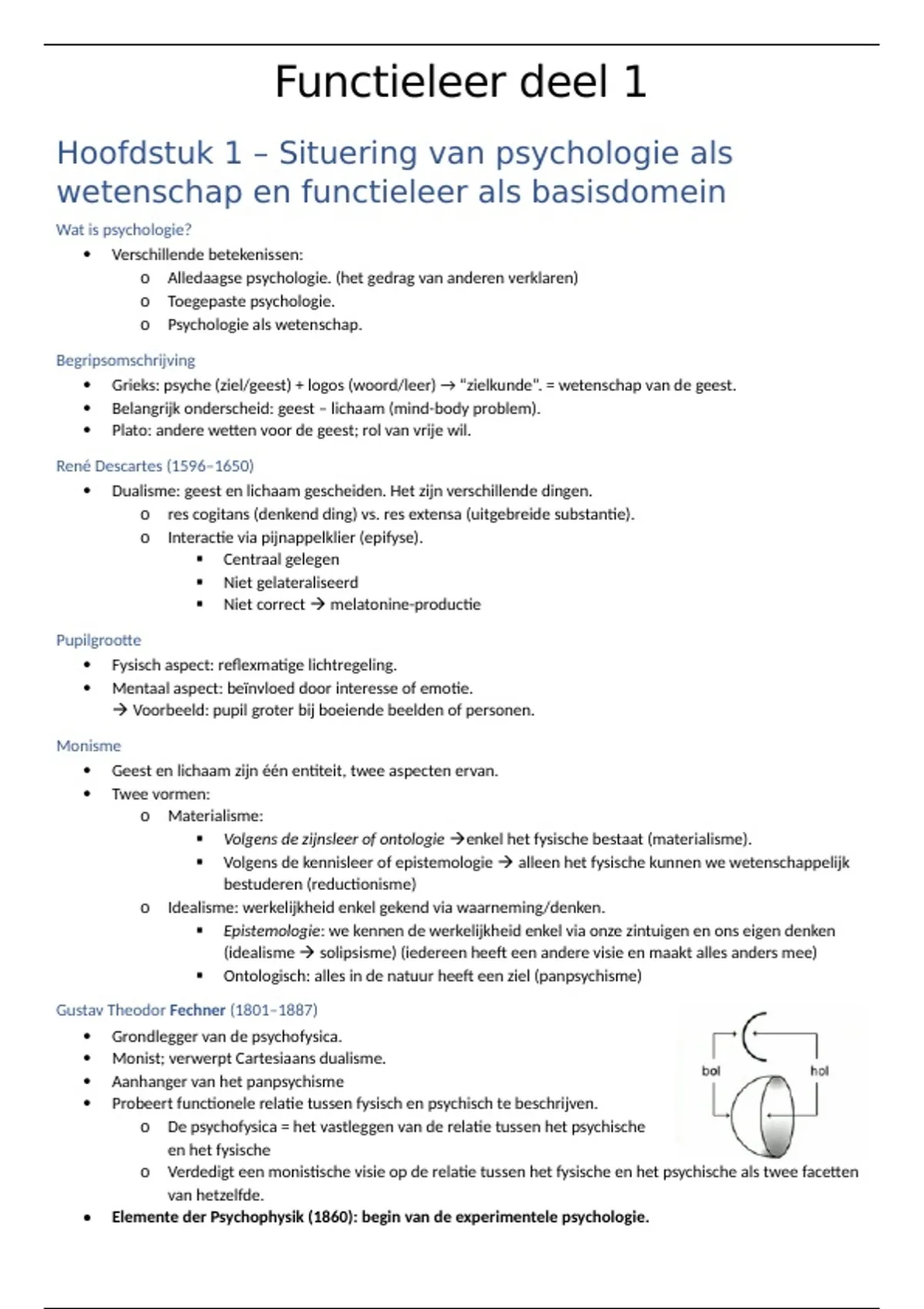 een volledige samenvatting van het vak functieleer deel 1 in het eerste jaar psychologie gegeven door professor Wagemans, het document is volledig met alle begrippen in het blauw en vet aangeduid en alle experimenten van de prof zelf worden extra in het rood aangeduid. de titels volgen bij de curus waardoor je makkelijk in het boek kunt volgen bij extra vragen.