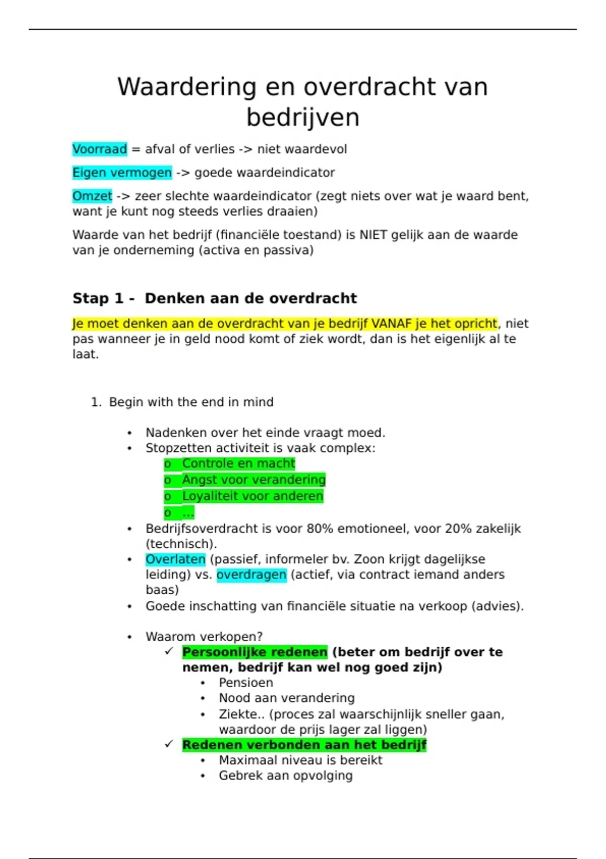 Samenvatting waardering en overdracht van bedrijven gegeven in 3e jaar kmo-management