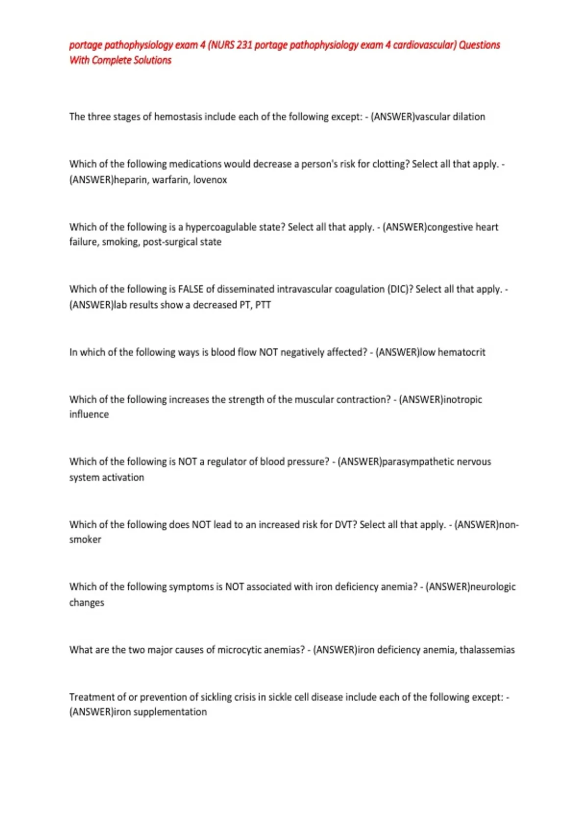 portage pathophysiology exam 4 (NURS 231 portage pathophysiology exam 4 cardiovascular) Questions