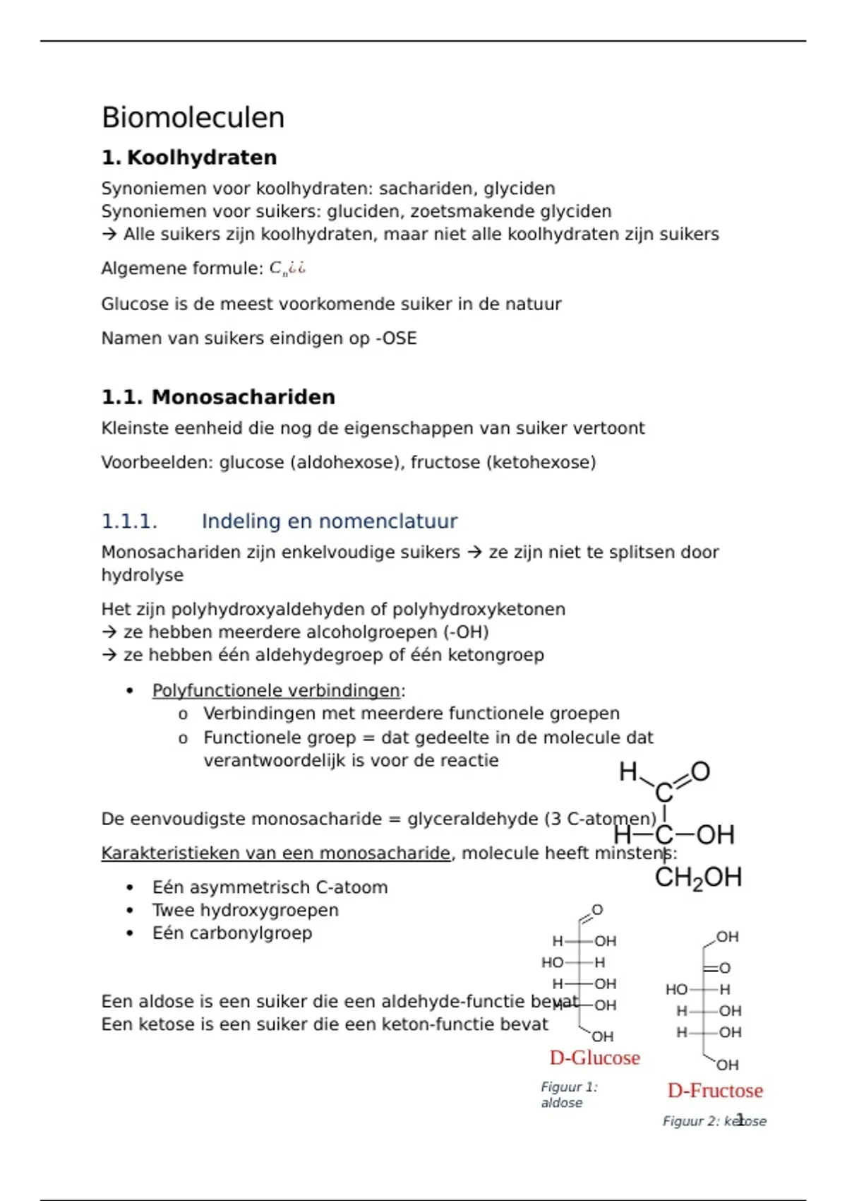 Deze samenvatting van biomoleculen omvat alle geziene hoofdstukken: koolhydraten, lipiden, nucleïnezuren, vitaminen, metabolisme van lipiden, metabolisme van koolhydraten, metabolisme van aminozuren, citroenzuurcyclus en de elektronentransportketen. De samenvatting is opgesteld op basis van de PowerPoint 's die tijdens de lessen werden gebruikt. Kleine opmerking: - Bij het onderdeel vitaminen ontbreekt vitamine B5; dit betrof slechts één dia uit de volledige PowerPoint. - Bij de citroenzuurcyclus zijn enkel de stappen van de cyclus samengevat. De bijkomende uitleg over de vrijstelling van metabole energie heb ik tijdens het studeren bekeken in de PowerPoint. De elektronentransportketen is wel volledig samengevat. Met deze samenvatting kon ik mijn examen goed invullen!