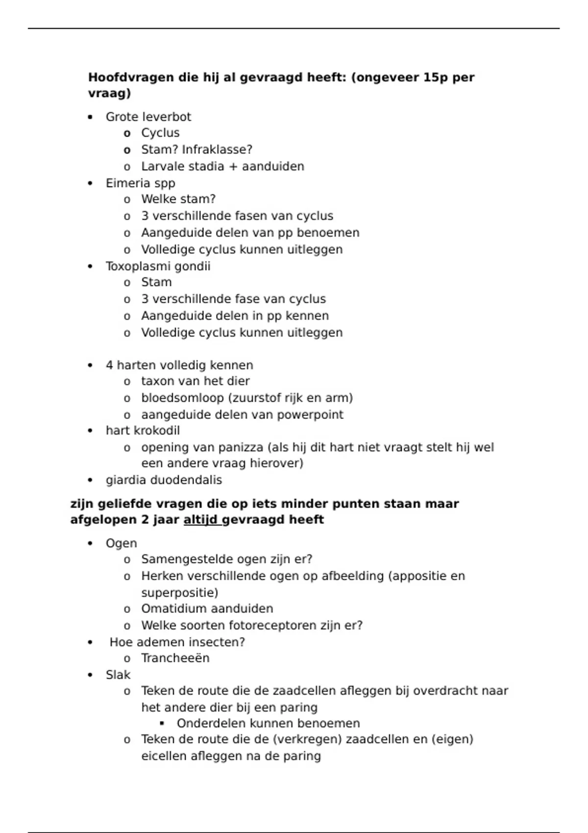 Dit document bevat een gestructureerd overzicht van belangrijke onderwerpen en mogelijke examenvragen voor het vak Toegepaste Dierkunde. Het overzicht is samengesteld op basis van eerder gestelde examenvragen en legt de nadruk op thema’s die regelmatig of herhaaldelijk terugkomen. ️Belangrijk Dit document is bedoeld als studiemateriaal en voorbeeld. Het kopiëren of overnemen van (delen van) deze inhoud en het indienen ervan als eigen werk is niet toegestaan en kan worden beschouwd als plagiaat. Studenten dienen deze informatie te gebruiken ter oriëntatie en eigen verwerking. Geschikt voor studenten Dierenzorg die zich voorbereiden op het examen Toegepaste Dierkunde.