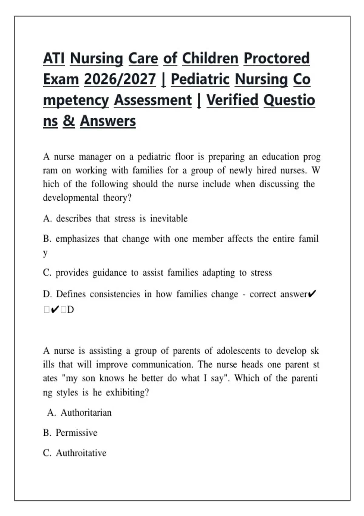 ATI Nursing Care of Children Proctored Exam Pediatric Nursing Competency Assessment