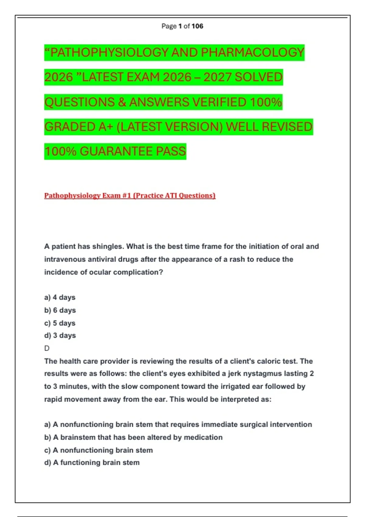 “PATHOPHYSIOLOGY AND PHARMACOLOGY 2026 ”LATEST EXAM 2026 – 2027 SOLVED QUESTIONS & ANSWERS VERIFIED 100% GRADED A+ (LATEST VERSION) WELL REVISED 100% GUARANTEE PASS