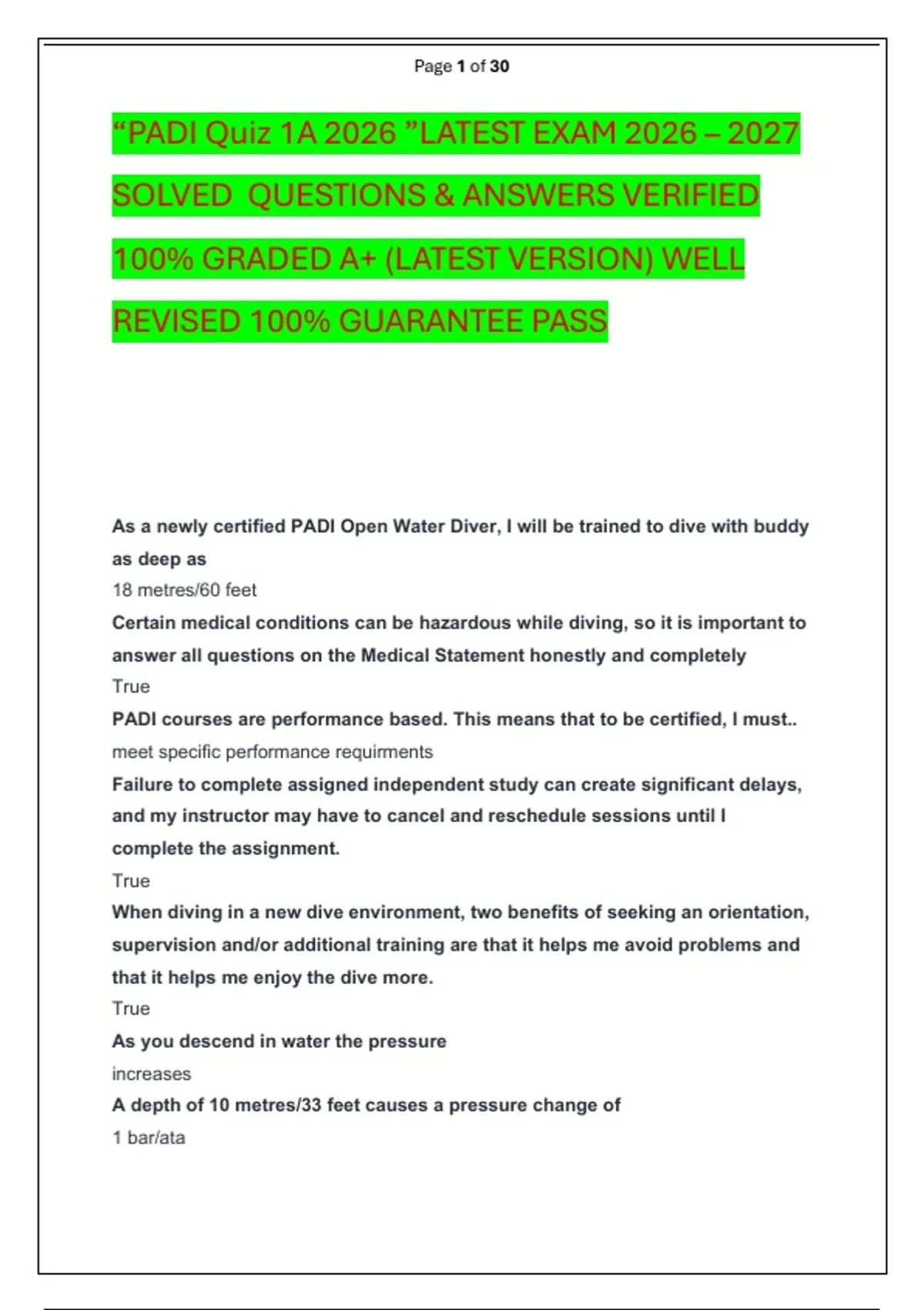 “PADI Quiz 1A 2026 ”LATEST EXAM 2026 – 2027 SOLVED QUESTIONS & ANSWERS VERIFIED 100% GRADED A+ (LATEST VERSION) WELL REVISED 100% GUARANTEE PASS