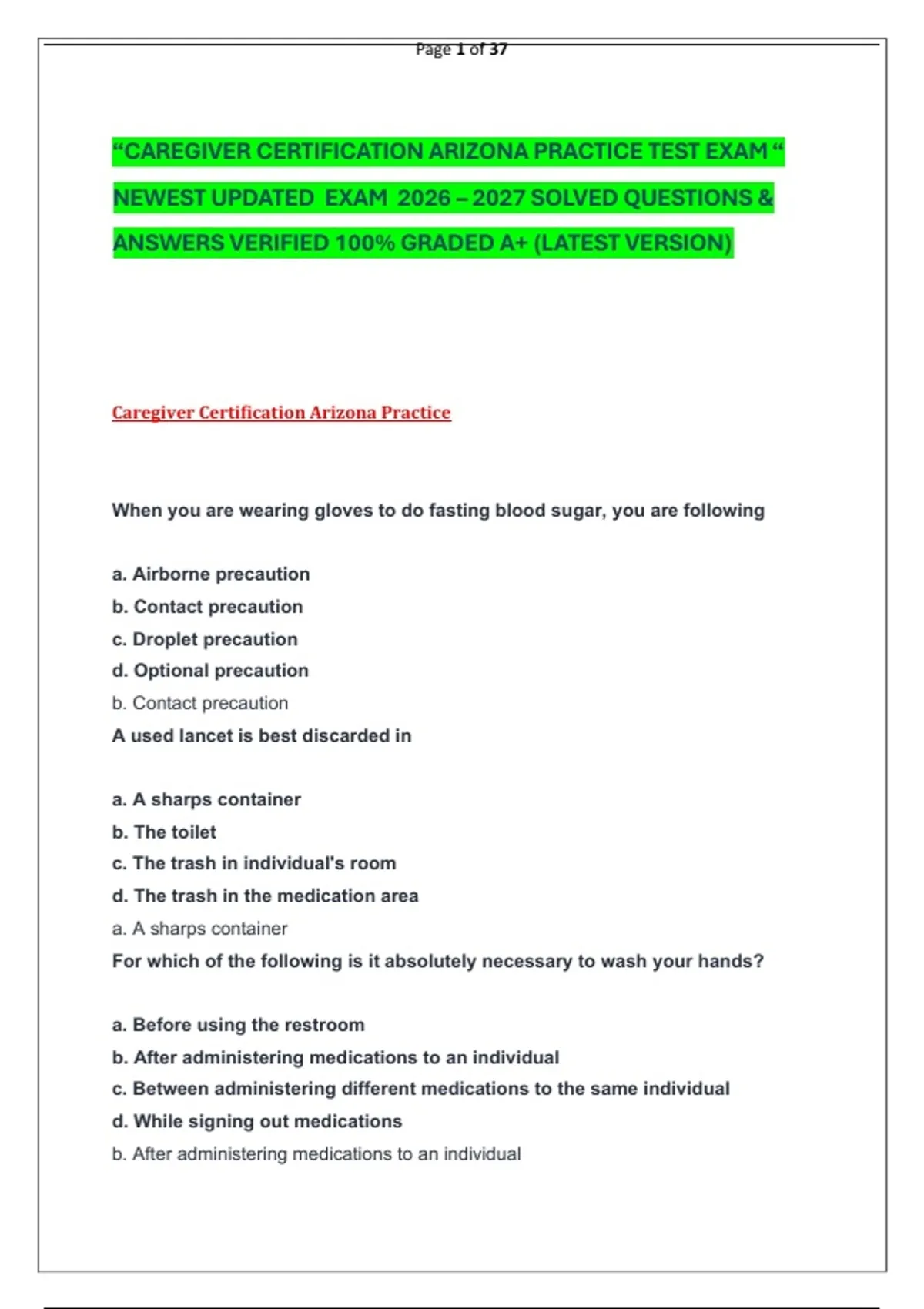 “CAREGIVER CERTIFICATION ARIZONA PRACTICE TEST EXAM “ NEWEST UPDATED EXAM 2026 – 2027 SOLVED QUESTIONS & ANSWERS VERIFIED 100% GRADED A+ (LATEST VERSION)