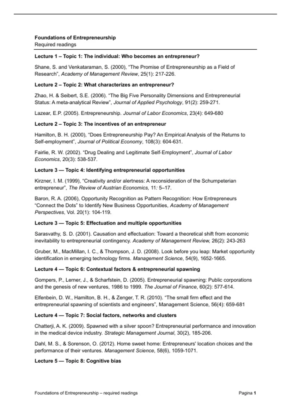Foundations of Entrepreneurship – required readings Pagina 1