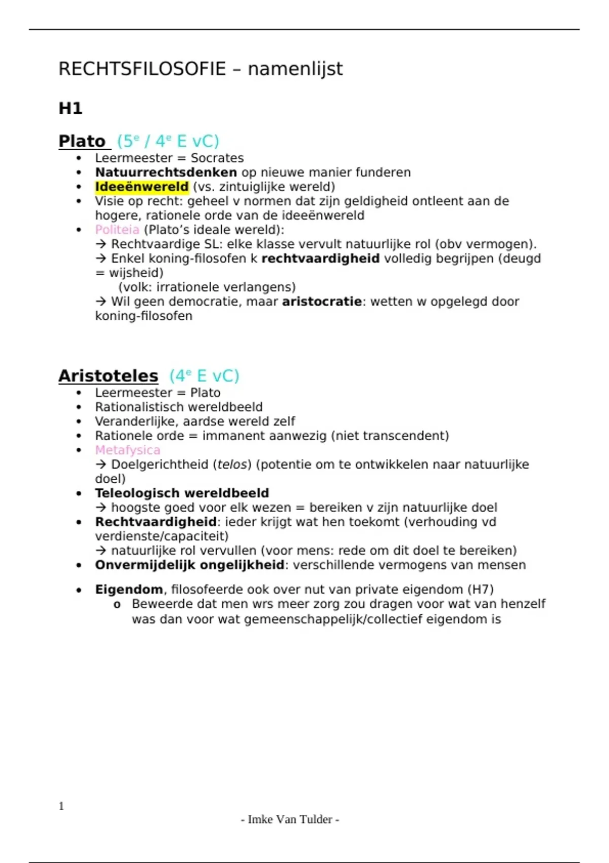 Dit is een samenvatting/namenlijst van het vak rechtsfilosofie, gegeven in de eerste bachelor aan de UA. Bijna de volledige cursus is gebaseerd op filosofen en hun ideeën, dus dit is een samenvatting met telkens namen als titel. Het is gemaakt in het academiejaar . Samenvatting is niet volledig, het stopt bij Robert Filmer (dit is meer dan 3/4 van de leerstof en het allerbelangrijkste deel). Maar als je, net als ik, in tijdsnood zou zitten en je dit bekijkt, kan je slagen. Mijn examen op 22 januari is gelukt door dit document 2u voor het examen te bekijken. Het is begrijpelijker uitgelegd dan in de cursus, en natuurlijk volledig op de cursus gebaseerd. Ik begin bij Plato (dit is nog niet zo uitgebreid, maar naar mate je verder leest wordt het steeds uitgebreider onder elke filosoof) en eindig bij Robert Filmer. Er worden verbanden gelegd tussen filosofen, die essentieel zijn om het examen te kunnen maken.