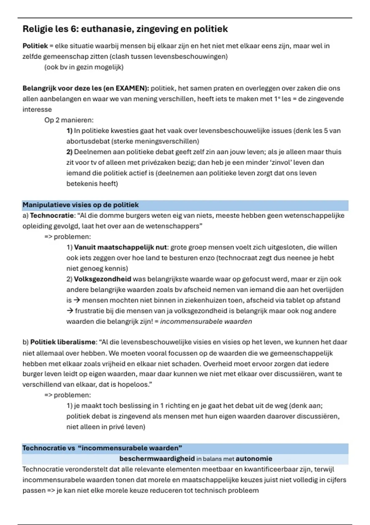 Samenvatting Les 6: euthanasie, zingeving en politiek