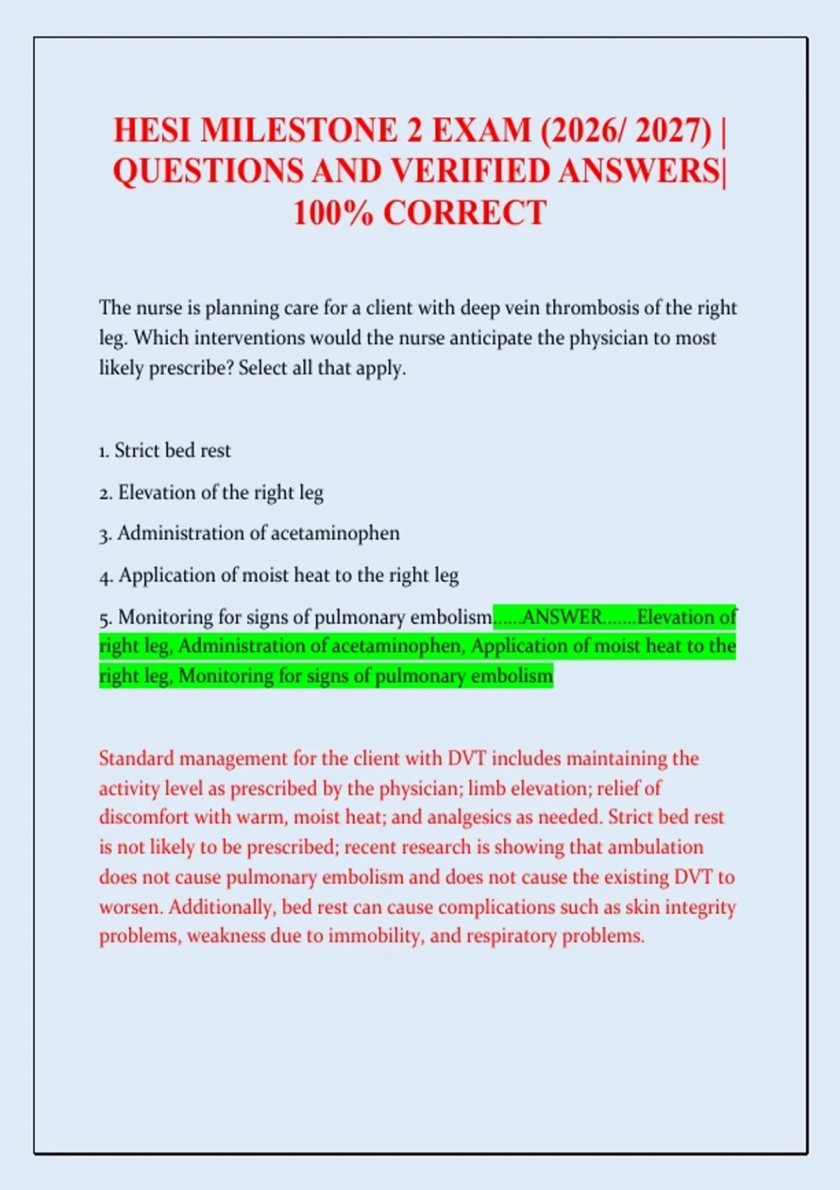 HESI Milestone 2 Exam 2026/2027 | Questions & Verified Answers 100% Correct