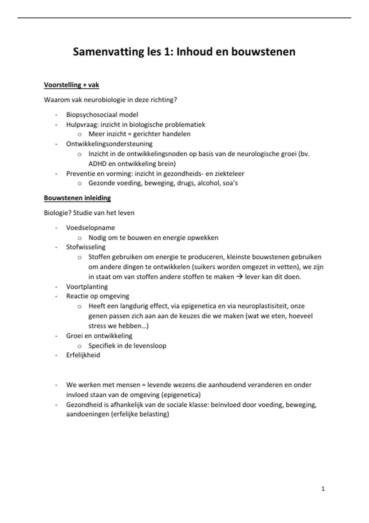 Samenvatting alle lessen Neurobiologie 1ste jaar sociale readaptatiewetenschappen (UCLL)