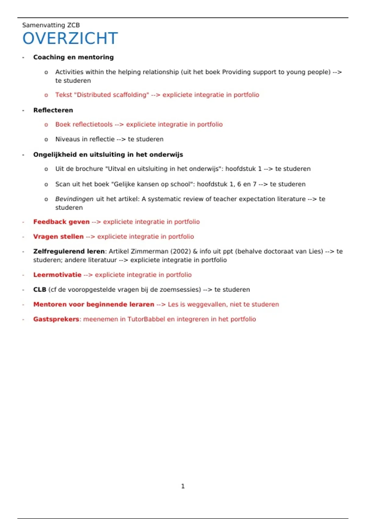 - Zelfregulerend leren: Artikel Zimmerman (2002) & info uit ppt (behalve doctoraat van Lies) --> te