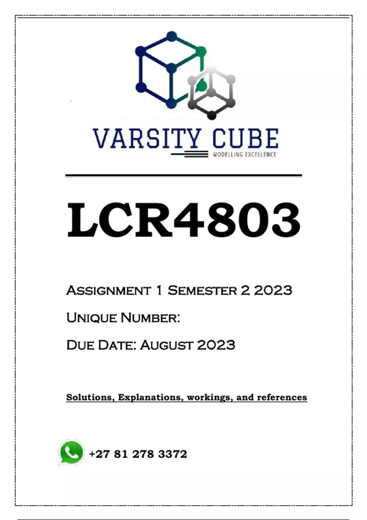 DPR2605 Assignment 3 (ANSWERS) Semester 2 2023 - DISTINCTION GUARANTEED Answers, guidelines, workings and references ....................................................... Introduction [2.5] The introduction has to provide a general overview of each topic that was discussed in this assignment. While writing the introduction, a logical flow of ideas needs to be maintained. The introduction should not have been written in bullet format, but rather in essay format. 1. The original brief for this social marketing programme was to develop a better smoking cessation service. However, as we have seen, the revised service offer incorporated a wide range of additional programmes, such as weight and stress management. What challenges might arise from increasing the scope of a programme like this, and how might you manage these challenges? [8] 2. What methodology was used in this qualitative study? [2] 3. Name the four barriers found in the case study and the responses that the programme had to these barriers? [8] 4. One of the key insights from this case study was that staff needed support and training to enable them to work across a range of health specialities (i.e. not just smoking cessation). What other approaches, beyond staff training, would help you to embed a programme and ensure that its sustainability was not threatened by local resistance to organisational change? (Your answer must be related specifically to the case study) [6] 5. What were the revised aims and objectives of this programme after further research? And how were these outcomes going to be measured by Vitality? [6] 6. Vitality is still growing and developing three years after its launch. As opposed to more time-bound, short-interval interventions, this illustrates how social marketing can involve a long-term, sustained process of change. How might your approach to developing and managing a long-term social marketing programme differ from a shorter-term campaign, and what steps would you need to take to ensure the longevity of your programme? (Your answer must be related specifically to the case study not some steps you found on Google) [10] 7. Using the Vitality case study as an example, and the additional reading given at the end of the case study, develop an social marketing intervention programme that is targeted at Grade 10 – 12 Students in Gauteng schools who are smokers. This intervention programme will run for 12 months. You will use the FOUR-STEP formula which followings these four steps: defining the problem; planning and programming; taking action and communicating; evaluating the programme for your intervention programme (Revisit your DPR1505 lessons to understand how this formula is applied). Your programme you will need to highlight the strategies you will use to meet this targeted audience, actions and activities that will be taken to stop smoking among these grade 10 – 12 students, and what communication tools you will use in this programme. The allocated budget will be 20 million, so you need to include a breakdown in table format of how this budget will be utilized. We want to see that the students applied each and every step in the process according to the formula, please use sub-headings in your answer so the marker can easily access your answer. [30] Mark breakdown: • defining the problem [5] • planning and programming [5] • taking action and communicating [10] • budget breakdown [5] • evaluating the programme [5] Conclusion [2.5] Your conclusion must summarise the discussion in your assignment. Tutorial Letter CMNALLE/301 contains guidelines on writing a conclusion.
