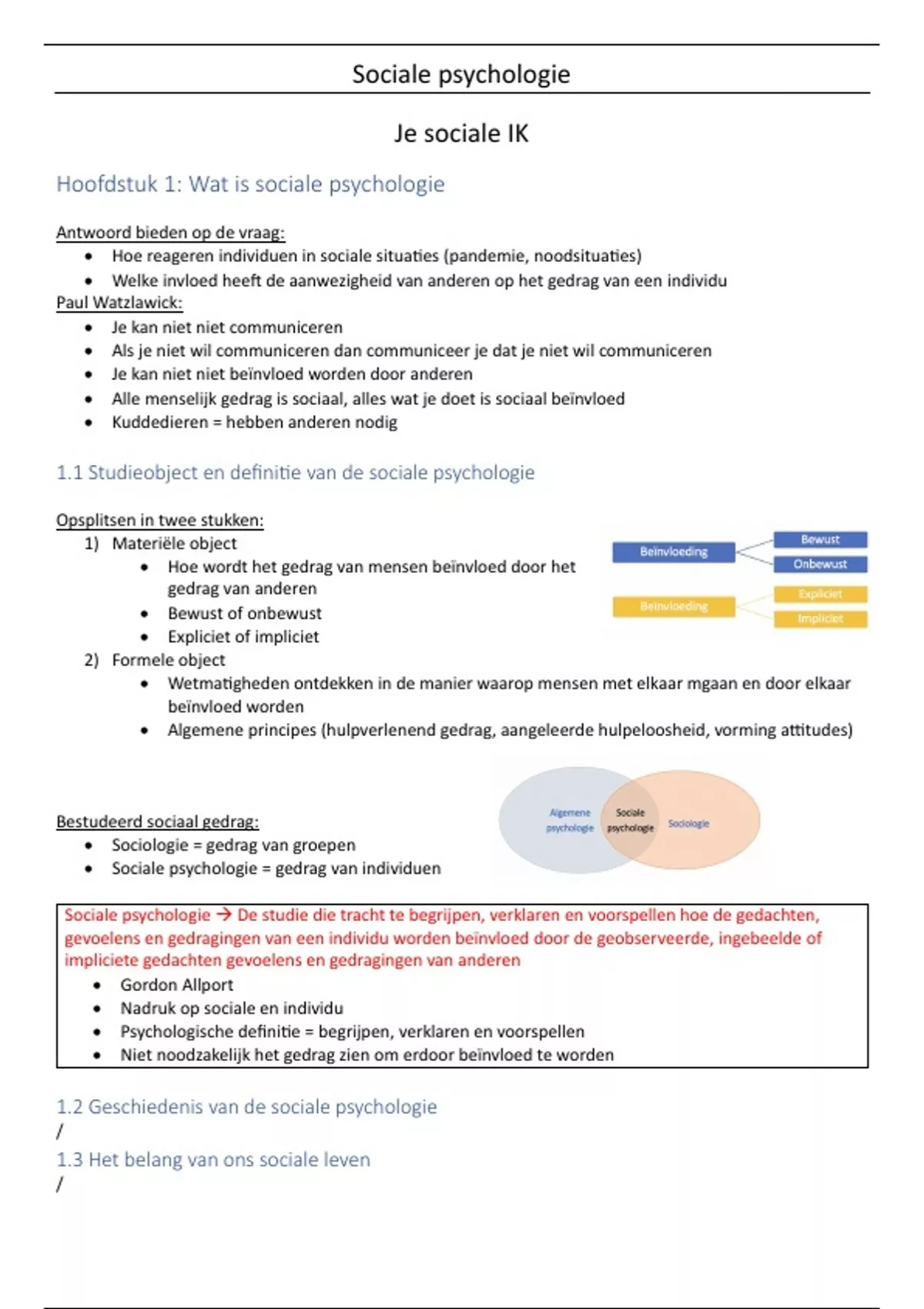 Geslaagd in eerste zit Dit is een samenvatting van het vak Sociale Psychologie met boek 'Je sociale Ik' van Stijn Meuleman en Liesbeth De Winter. Dit bevat powerpoints, cursus en notities uit de les. Hoofdstukken dat voorkomen: 1. Wat is sociale psychologie 2. Hulpverlenend gedrag 3. Agressie 4. Gehoorzaamheid 5. Macht en onmacht 6. Sociale cognitie en sociale perceptie 7. Zelfcognitie en zelfperceptie 8. Attitudeleer 9. Het individu versus de groep