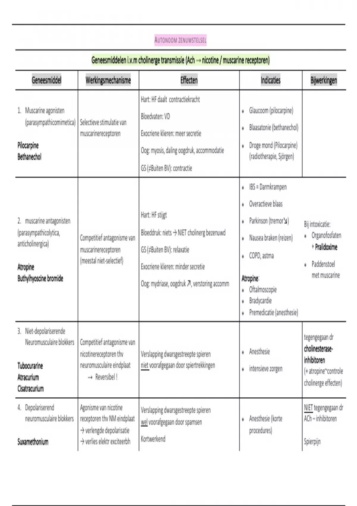 4. Depolariserend Agonisme van nicotine Verslapping dwarsgestreepte spieren NIET tegengegaan dr