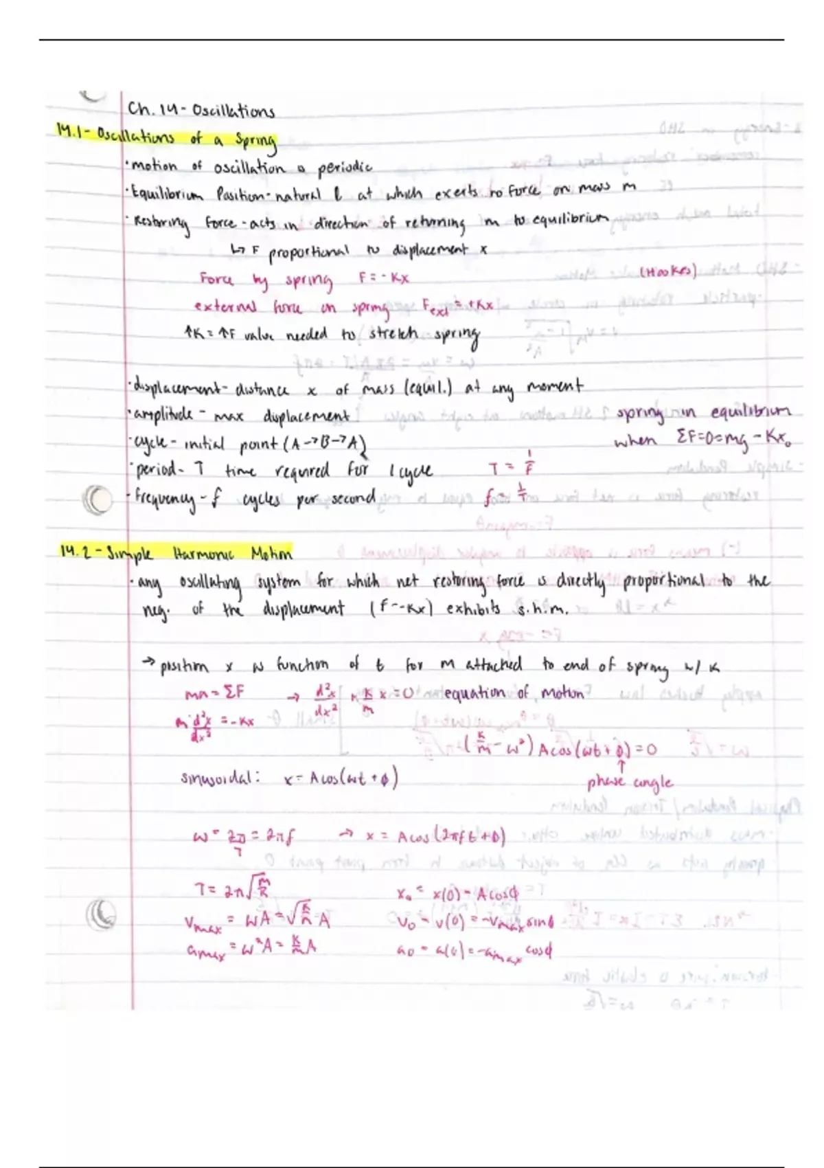 Ch 14 notes including: oscillations of springs, simple harmonic motion, energy in simple harmonic oscillations, circular motion, simple pendulum, tension pendulum, and damped harmonic motion