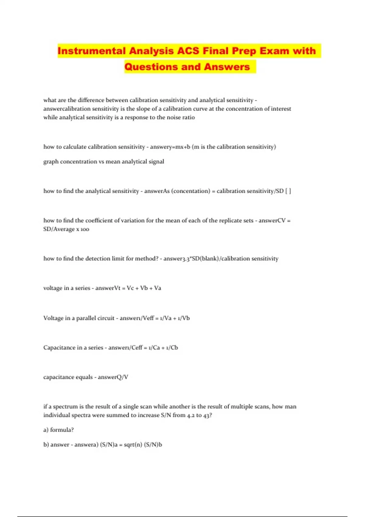 Instrumental Analysis ACS Final Prep Exam with Questions and Answers. what are the difference between calibration sensitivity and analytical sensitivity - answercalibration sensitivity is the slope of a calibration curve at the concentration of interest while analytical sensitivity is a response to the noise ratio how to calculate calibration sensitivity - answery=mx+b (m is the calibration sensitivity) graph concentration vs mean analytical signal how to find the analytical sensitivity - answerAs (concentation) = calibration sensitivity/SD [ ] how to find the coefficient of variation for the mean of each of the replicate sets - answerCV = SD/Average x 100 how to find the detection limit for method? - answer3.3*SD(blank)/calibration sensitivity voltage in a series - answerVt = Vc + Vb + Va Voltage in a parallel circuit - answer1/Veff = 1/Va + 1/Vb Capacitance in a series - answer1/Ceff = 1/Ca + 1/Cb capacitance equals - answerQ/V if a spectrum is the result of a single scan while another is the result of multiple scans, how man individual spectra were summed to increase S/N from 4.2 to 43? a) formula? b) answer - answera) (S/N)a = sqrt(n) (S/N)b b) 105 what type of noise can be reduced by decreasing the temperature of a measurement - answerthermal noise what type of noise can be reduced by decreasing the frequency used for the measurement - answerflicker noise what type of noise can be reduced by decreasing the bandwidth of the measurement - answerenvironmental noise What would be an appropriate source and detector to determine the emission lines for lithium from 200 to 780 nm? - answerflame and photo multiplier tube (PMT) you've been asked to measure the UV absorbance of a sample containing poly cyclic aromatic hydrocarbons, a byproduct of the incomplete combustion of organic matter. What would be an appropriate material for the sample container? - answerfused silica or quartz which of the following changes will result in a decreased effective bandwidth? a) increasing the number of blazes in the monochromatic grating b) switching from a short-pass filter to a long-pass filter c) increasing sample concentration d) decreasing the amount of stray light - answera what would be the distance between blazes for a grating where the first order diffraction line for 600 nm light is reflected at 10 degrees and the angle of incidence light is 45 degrees? a) formula b) answer - answera) n(wavelength) = distance*(sin(i)+sin(r)) b) 680 nm.