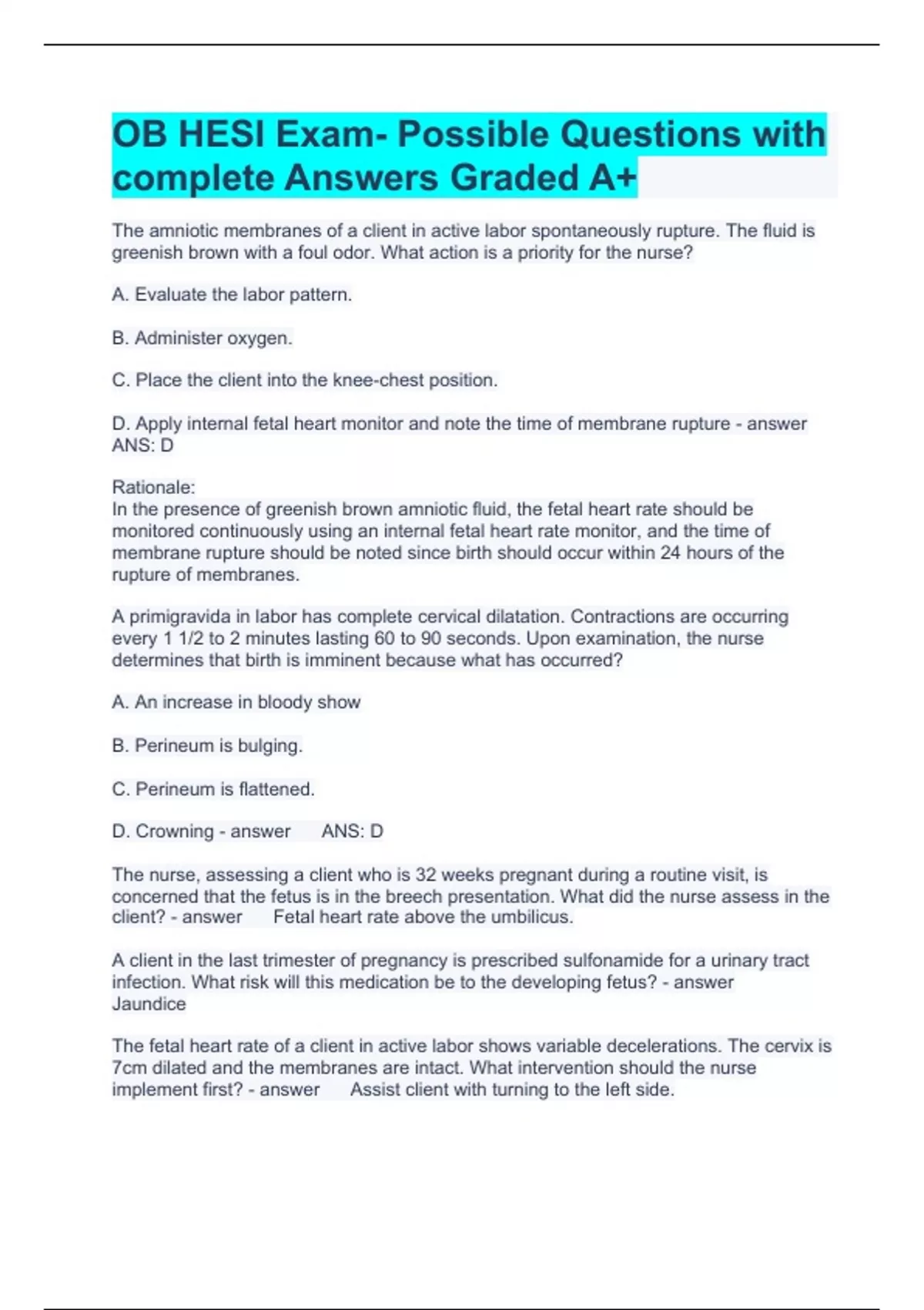 OB HESI Exam- Possible Questions with complete Answers Graded A+ The amniotic membranes of a client in active labor spontaneously rupture. The fluid is greenish brown with a foul odor. What action is a priority for the nurse? A. Evaluate the labor pattern. B. Administer oxygen. C. Place the client into the knee-chest position. D. Apply internal fetal heart monitor and note the time of membrane rupture ANS: D Rationale: In the presence of greenish brown amniotic fluid, the fetal heart rate should be monitored continuously using an internal fetal heart rate monitor, and the time of membrane rupture should be noted since birth should occur within 24 hours of the rupture of membranes. A primigravida in labor has complete cervical dilatation. Contractions are occurring every 1 1/2 to 2 minutes lasting 60 to 90 seconds. Upon examination, the nurse determines that birth is imminent because what has occurred? A. An increase in bloody show B. Perineum is bulging. C. Perineum is flattened. D. Crowning ANS: D The nurse, assessing a client who is 32 weeks pregnant during a routine visit, is concerned that the fetus is in the breech presentation. What did the nurse assess in the client? Fetal heart rate above the umbilicus. A client in the last trimester of pregnancy is prescribed sulfonamide for a urinary tract infection. What risk will this medication be to the developing fetus? Jaundice The fetal heart rate of a client in active labor shows variable decelerations. The cervix is 7cm dilated and the membranes are intact. What intervention should the nurse implement first? Assist client with turning to the left side. An Rh negative mother and an Rh positive father are expecting a child. Screening revealed a positive indirect coombs test. Which statement regarding this result is correct? There is no need to administer RhoGAM to this woman. A client, pregnant with her first child, tells the nurse that she is vegan. When discussing the client's nutritional needs, what should the nurse include? Use fortified soy or rice milk to meet dairy needs. A woman in the first trimester of her pregnancy has a Hemoglobin level of 11 mg/dl and MCV of 113 fL. What action should the nurse take? Determine folate and Vitamin B12 levels. A woman in the active phase of labor takes slow, deep breaths at the beginning of each contraction, while increasing the rate and decreasing the depth of her breaths as she reaches the peak of the contraction. Once the contraction is over, her breathing becomes slower and deeper again. What breathing pattern does the nurse recognize this client is using? Modified-paced breathing A pregnant client at risk for preterm labor has received betamethasone (Celestone) for 2 days. What is most important for the nurse to monitor? Blood glucose level The nurse is preparing a presentation on the organs of the developing fetus for a group of expecting families. When preparing this material, the nurse will include which organ system as being the most developed by 3 weeks of gestation? Cardiovascular system