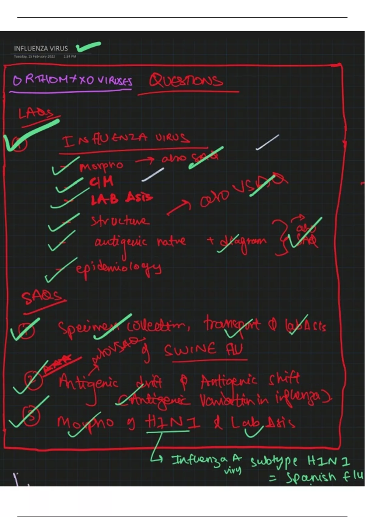 This document has my handwritten notes that i made myself while referring my class lectures as well as online lectures by great microbiology professors. I made these notes for myself to learn the topic of Influenza better and faster especially for revision during my university exams but i also kept in mind that i will be needing these notes during revision for competitive exams with multiple choice questions like neet pg or next. This document discusses Influenza in the subheadings of QUESTIONS AND ANSWERS pertaining to the STRUCTURE, ANTIGENIC NATURE, VARIATION, PATHOGENESIS, CLINICAL MANIFESTATIONS, EPIDEMIOLOGY, LAB DIAGNOSIS and PREVENTION of transmission of the virus.
