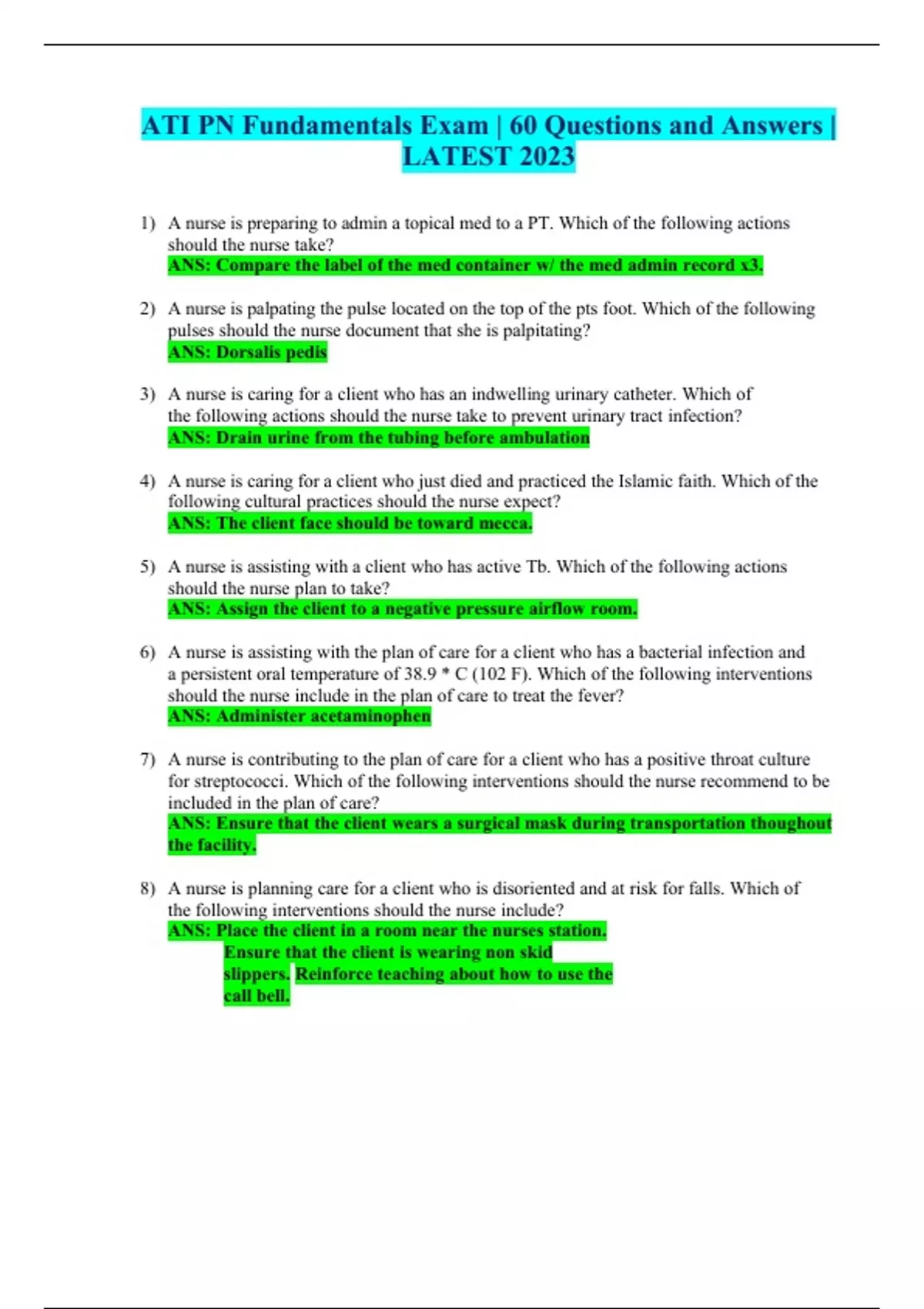 1) A nurse is preparing to admin a topical med to a PT. Which of the following actions should the nurse take? ANS: Compare the label of the med container w/ the med admin record x3. 2) A nurse is palpating the pulse located on the top of the pts foot. Which of the following pulses should the nurse document that she is palpitating? ANS: Dorsalis pedis 3) A nurse is caring for a client who has an indwelling urinary catheter. Which of the following actions should the nurse take to prevent urinary tract infection? ANS: Drain urine from the tubing before ambulation 4) A nurse is caring for a client who just died and practiced the Islamic faith. Which of the following cultural practices should the nurse expect? ANS: The client face should be toward mecca.