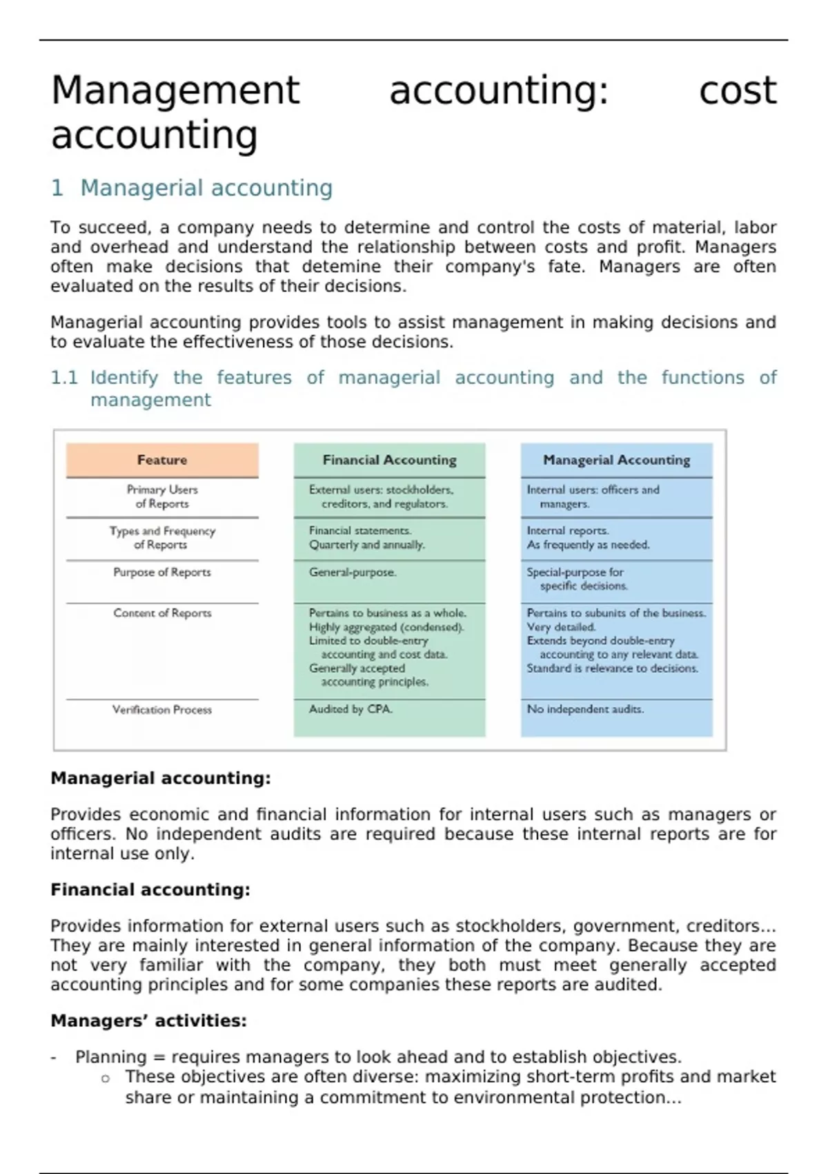 1.1 Identify the features of managerial accounting and the functions of